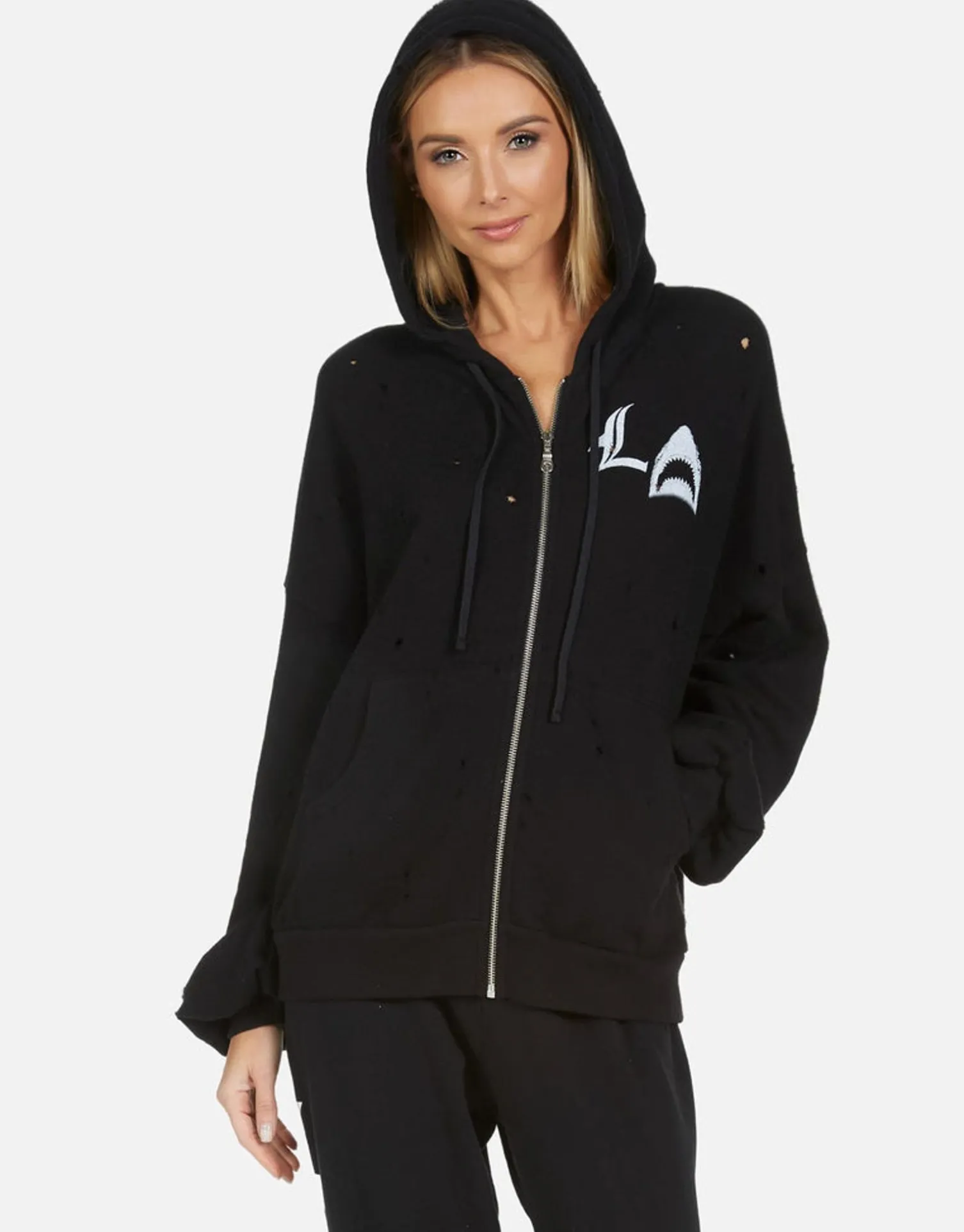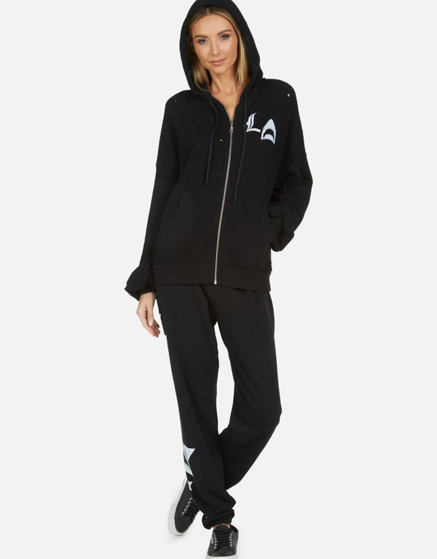 La Star Shark Printed On Ultra Soft Lightweight Hoodie In Black By Lauren Moshi.