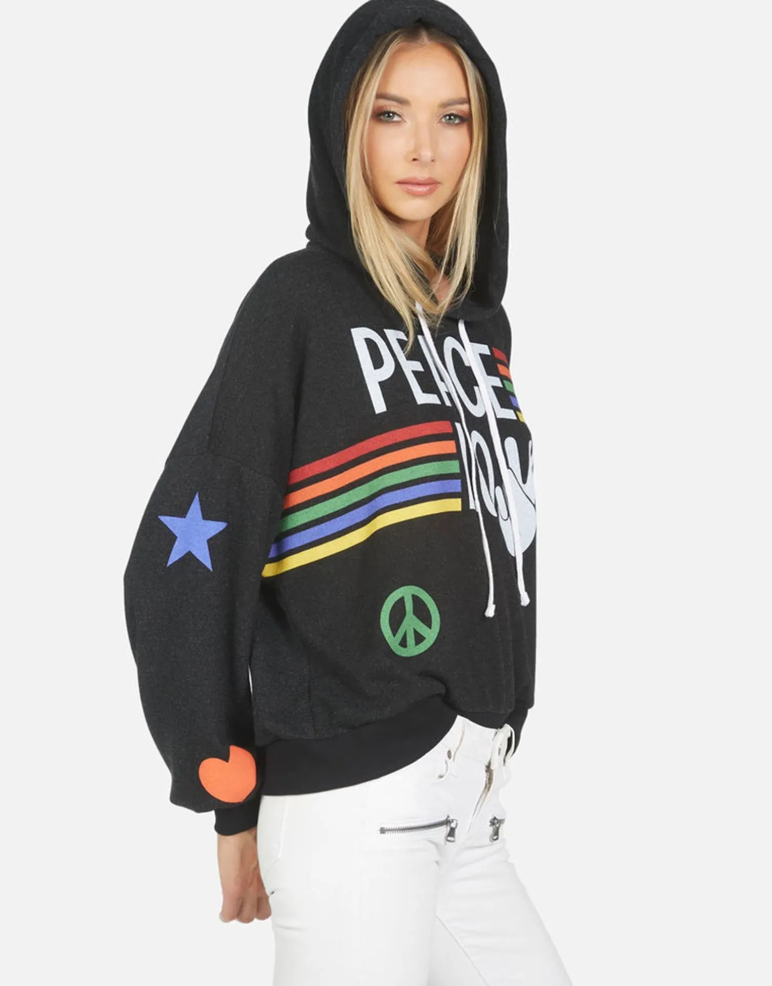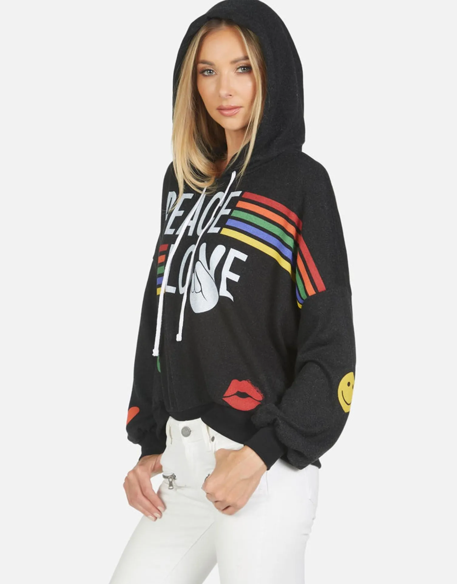 Peace Love Stripe Printed On Ultra Soft Lightweight Hoodie In Black By Lauren Moshi.