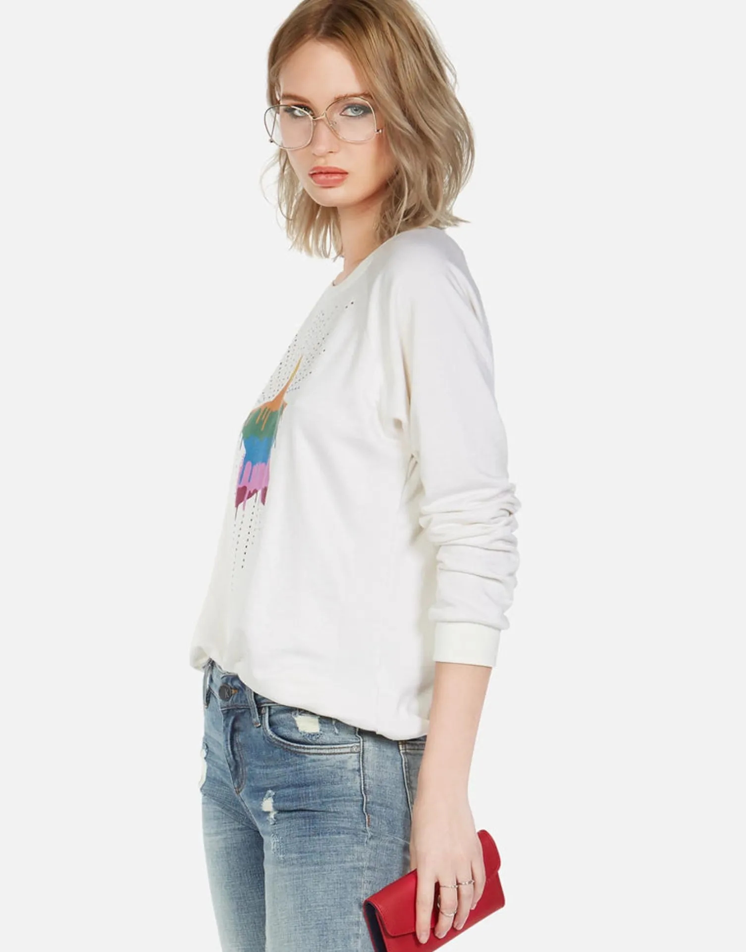 Dripping Star Printed On Ultra Soft Lightweight Pullover In Milk By Lauren Moshi.