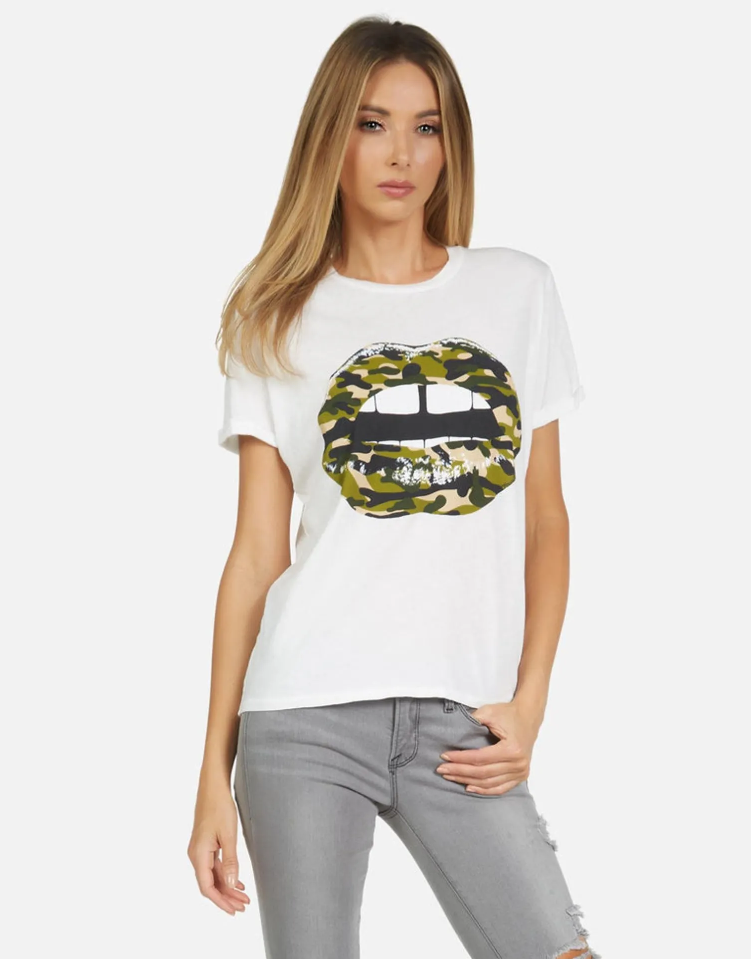 Camo Lip Printed On Ultra Soft Lightweight Tee In Milk By Lauren Moshi.