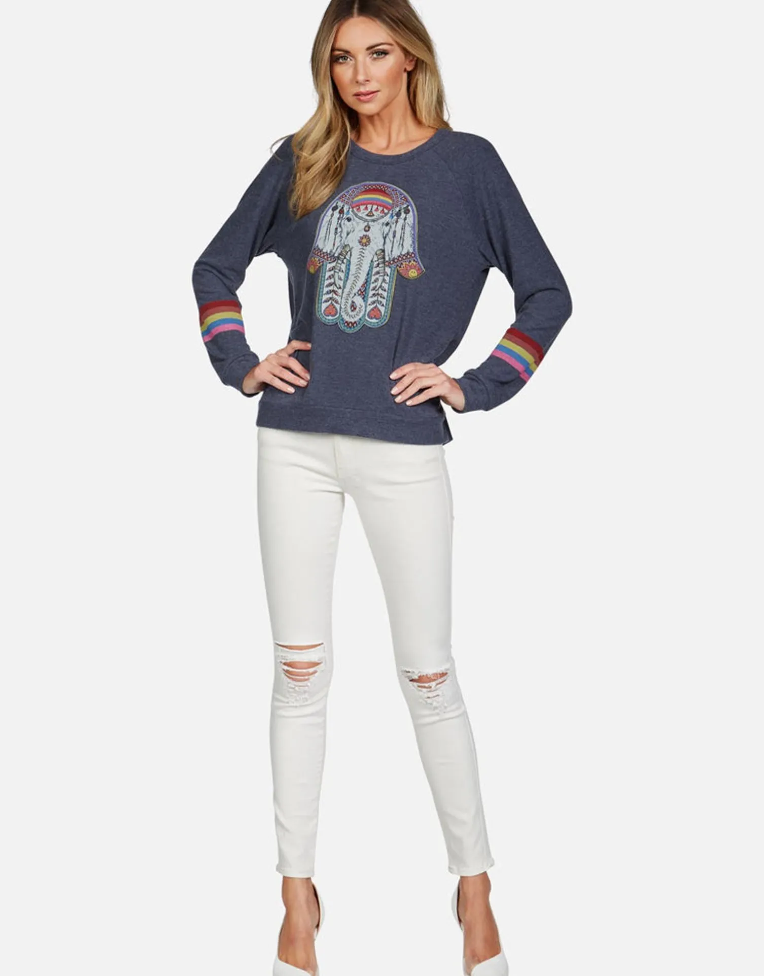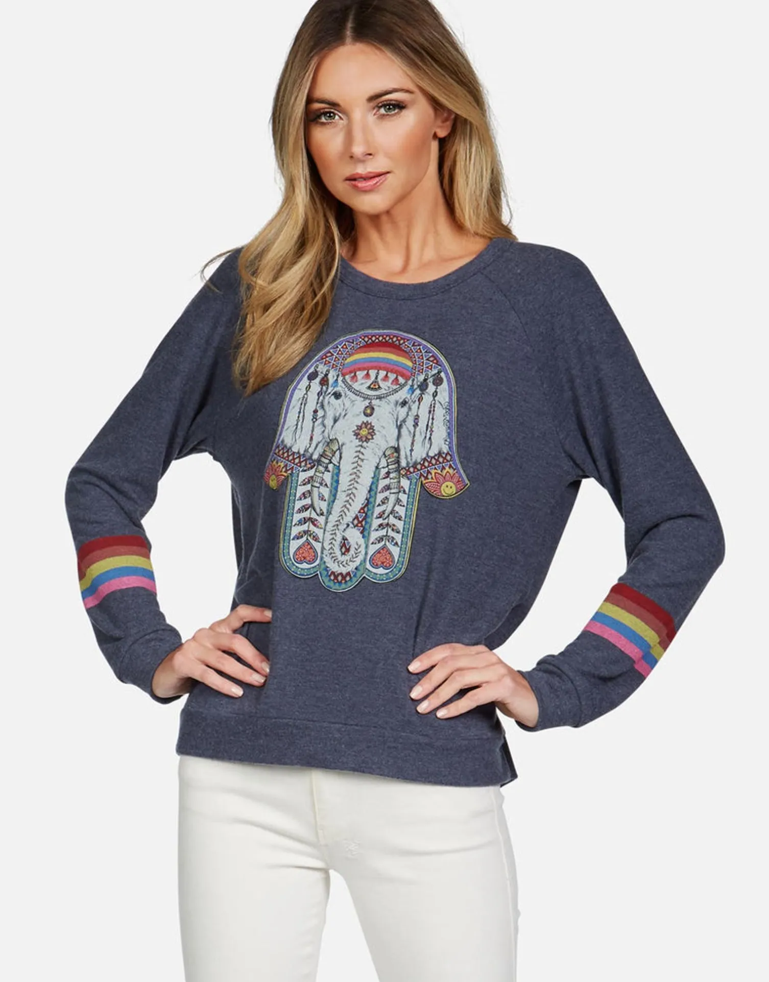 Elephant Hamsa Printed On Ultra Soft Lightweight Raglan Pullover In Navy By Lauren Moshi.