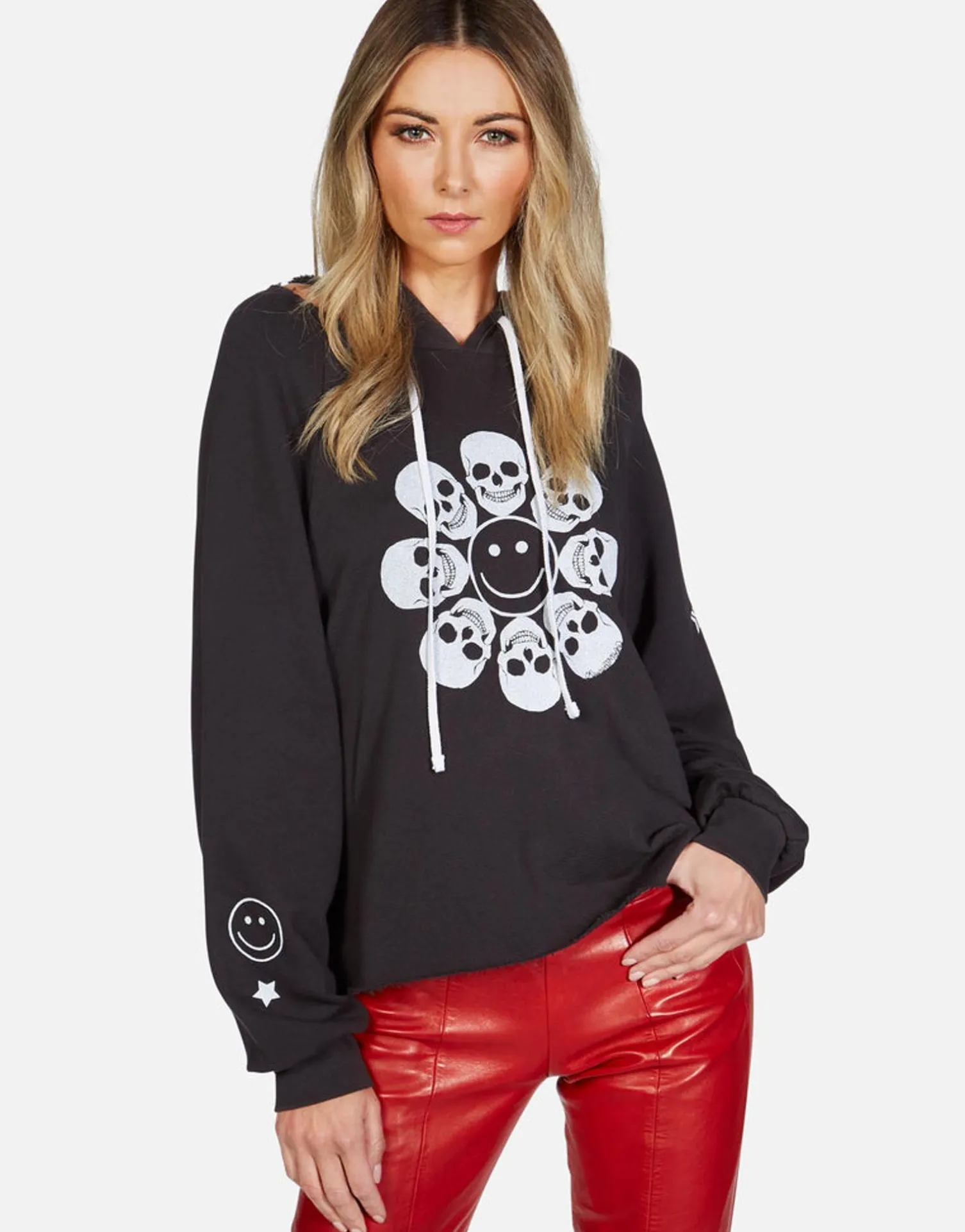 Happy Skull Flower Printed On Ultra Soft Lightweight Hoodie In Onyx By Lauren Moshi.