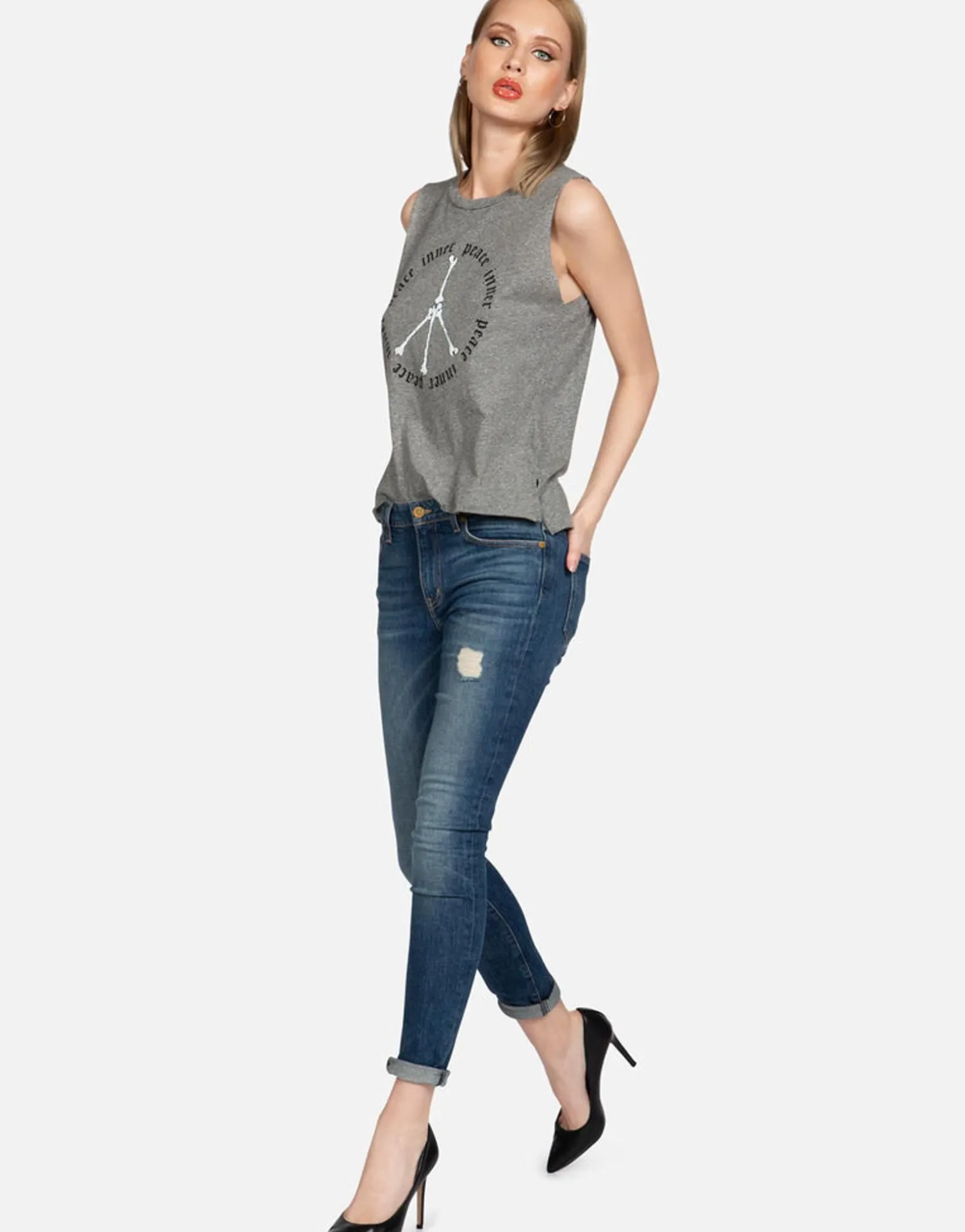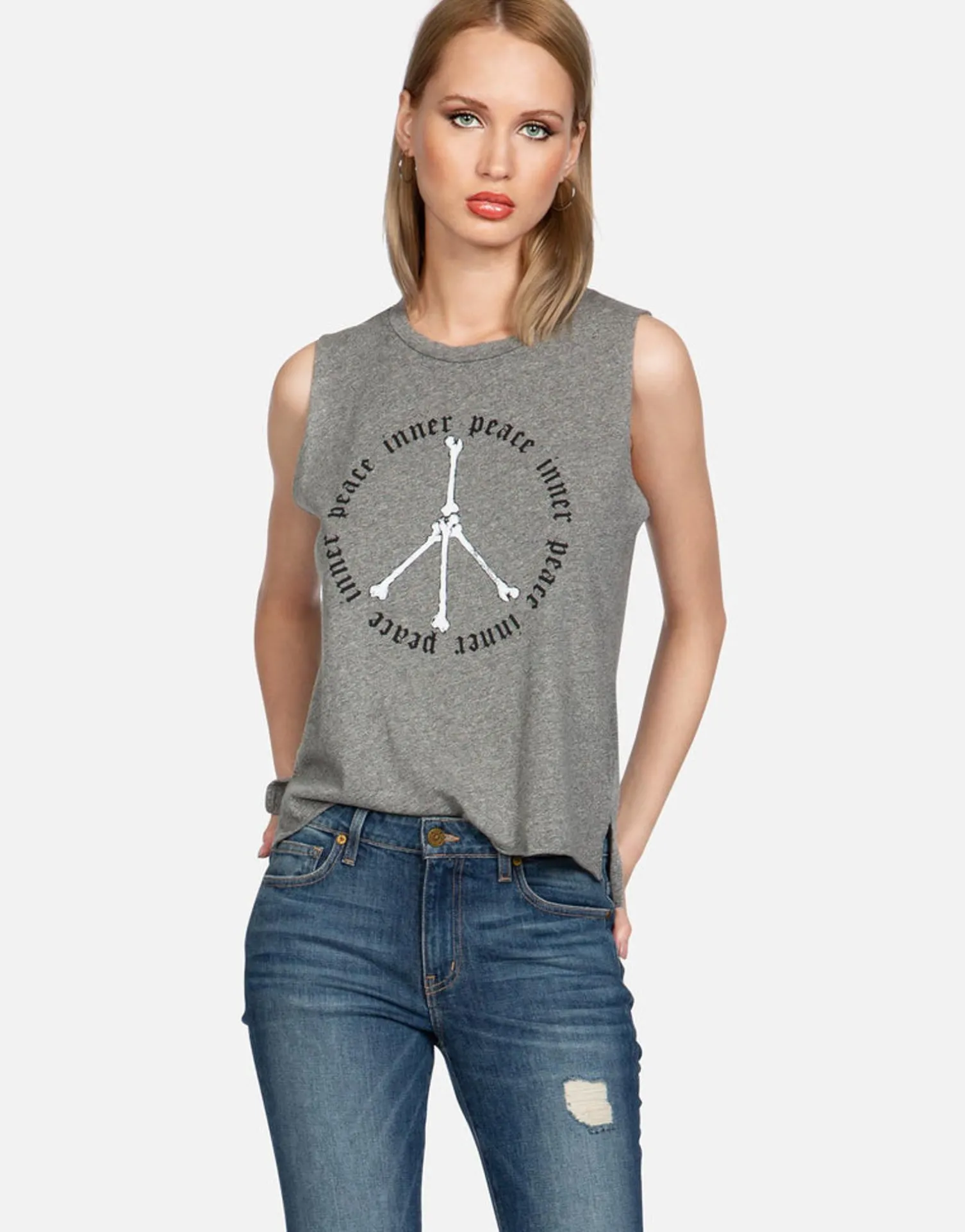 Inner Peace Sign Printed On Ultra Soft Lightweight Tank In Heather Grey By Lauren Moshi.