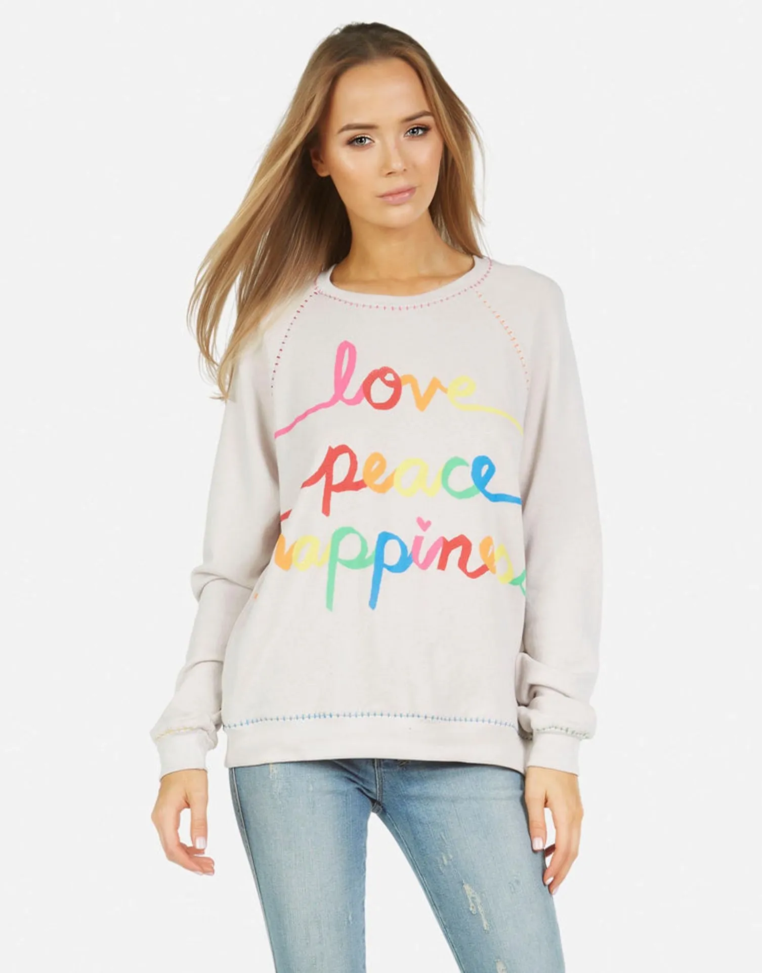Love Peace Happiness Printed On Ultra Soft Lightweight Pullover In Cloud By Lauren Moshi.
