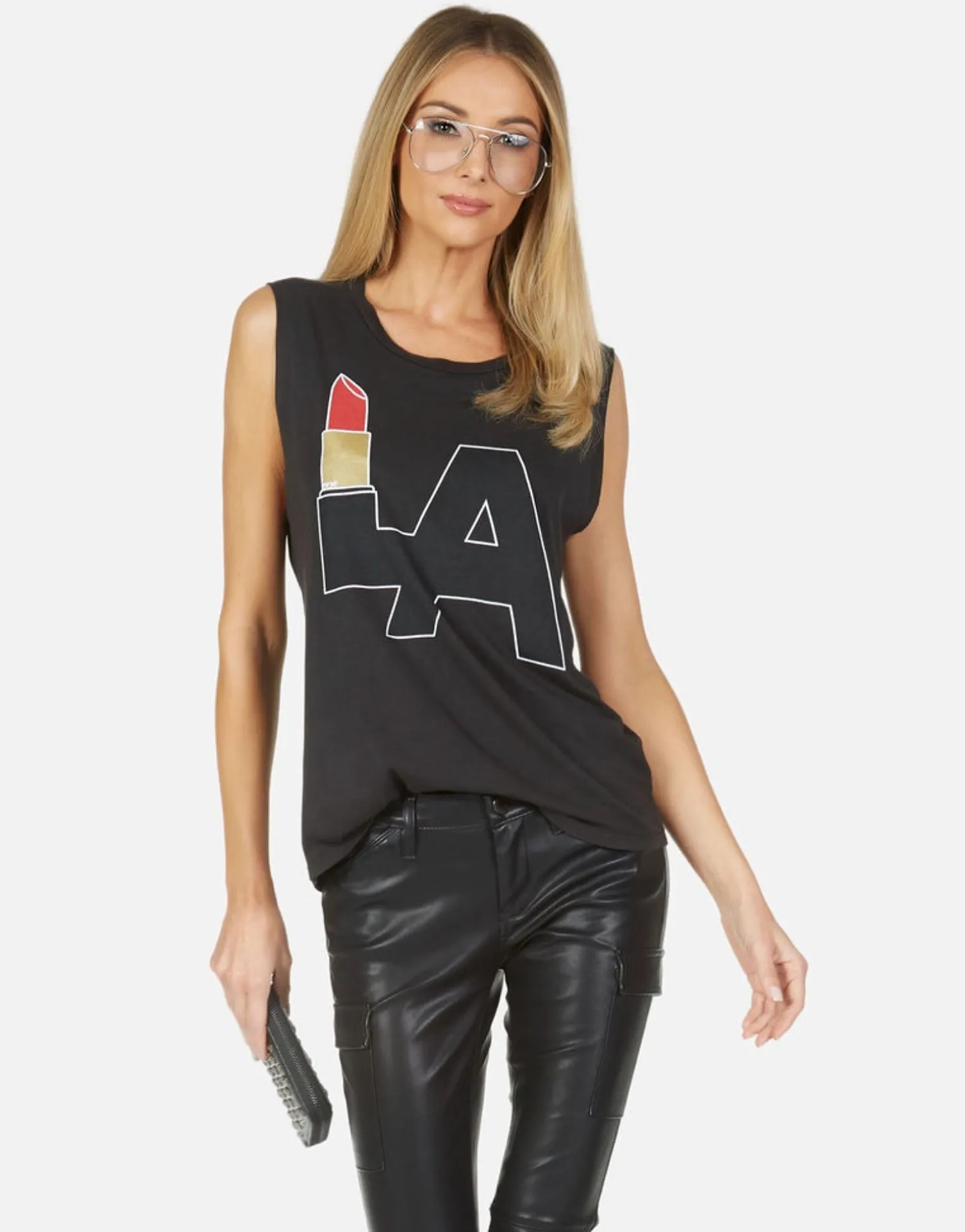 La Lipstick Printed On Ultra Soft Lightweight Muscle Tank In Onyx By Lauren Moshi.