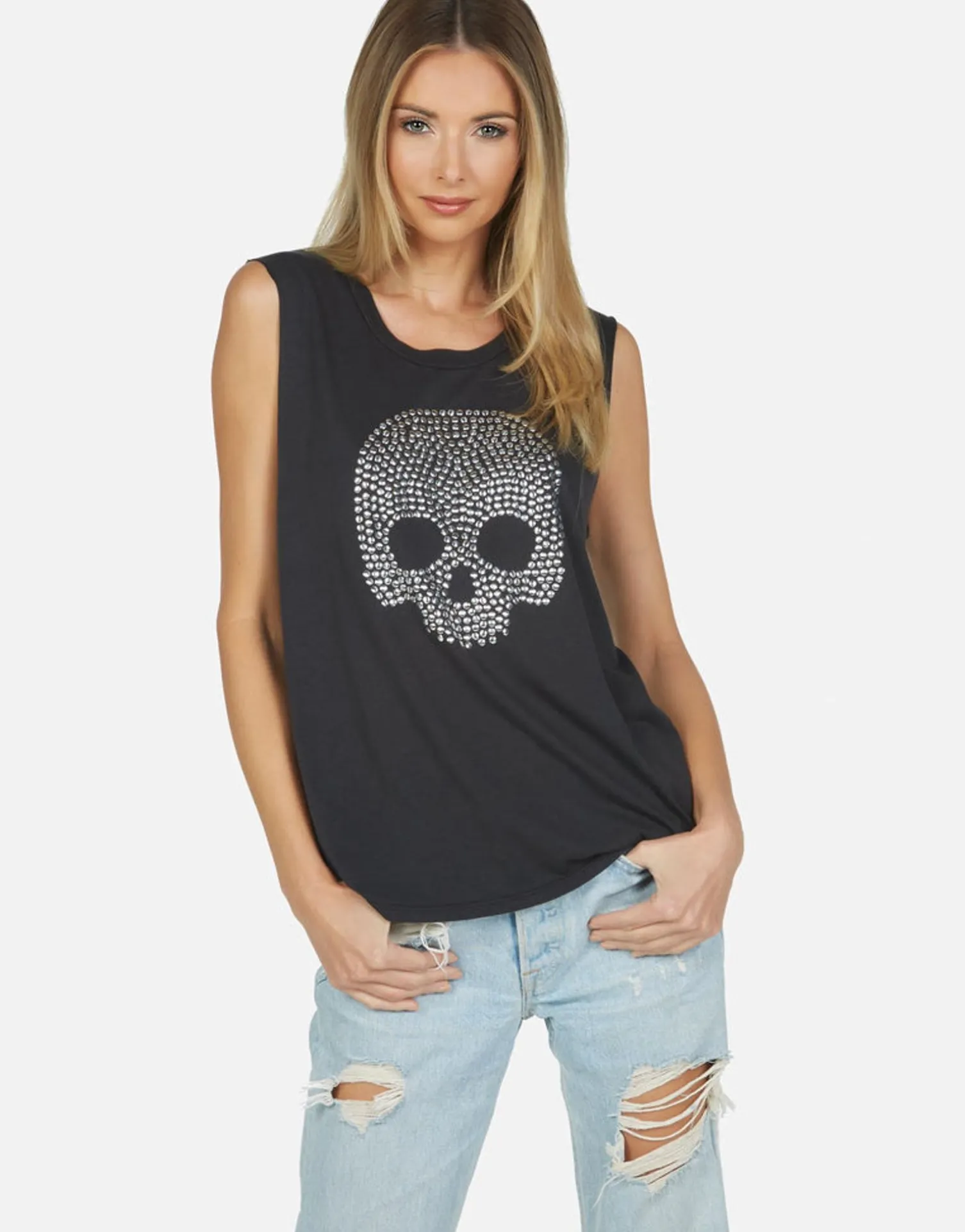 Nailhead Skull Printed On Ultra Soft Lightweight Tank Tee In Onyx By Lauren Moshi.