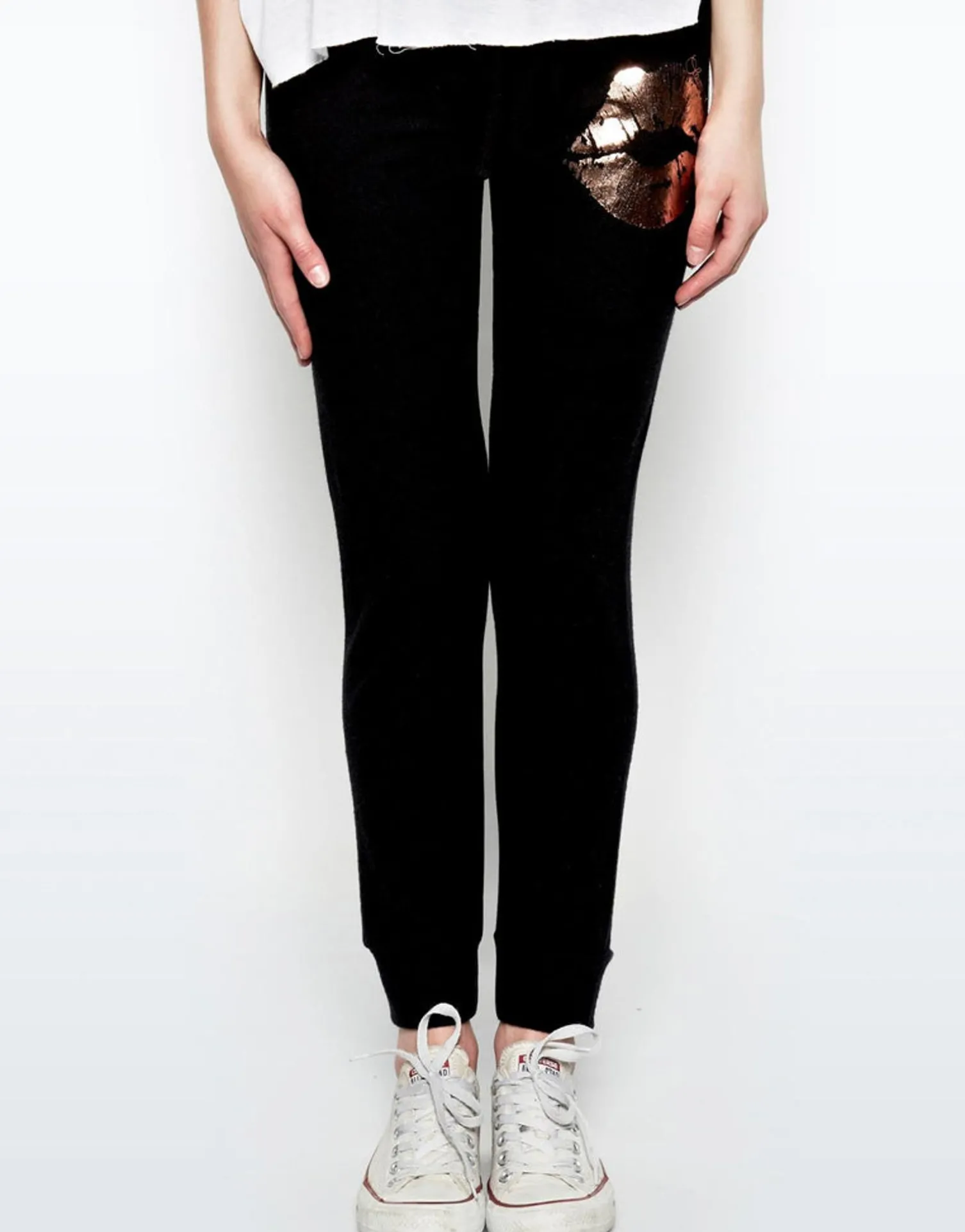Rose Gold Foil Lip Printed On Ultra Soft Lightweight Sweatpant In Black By Lauren Moshi.