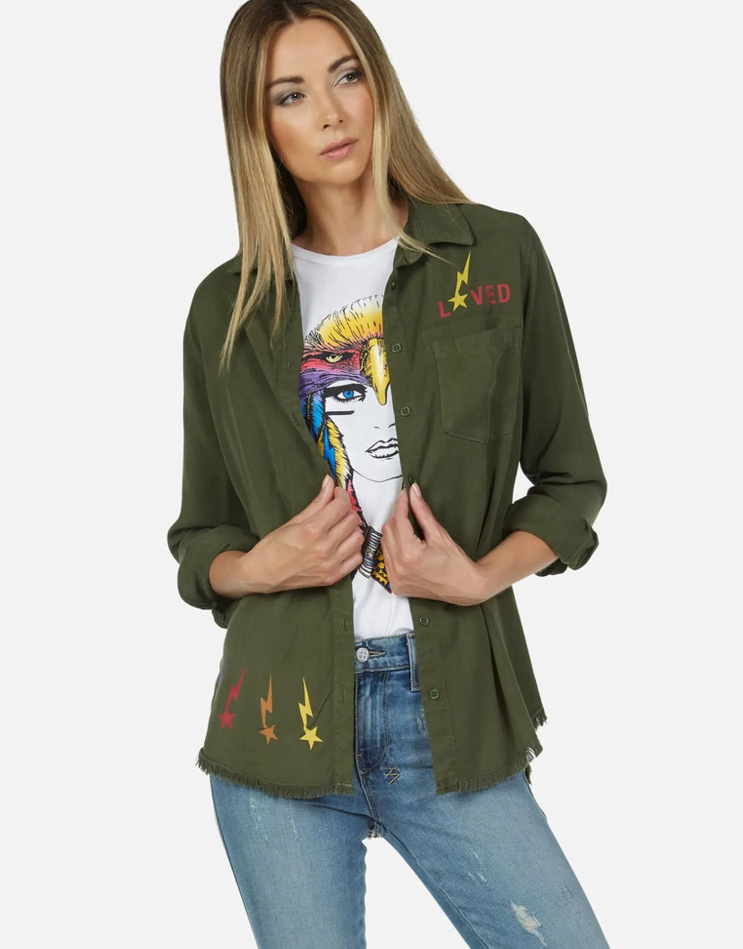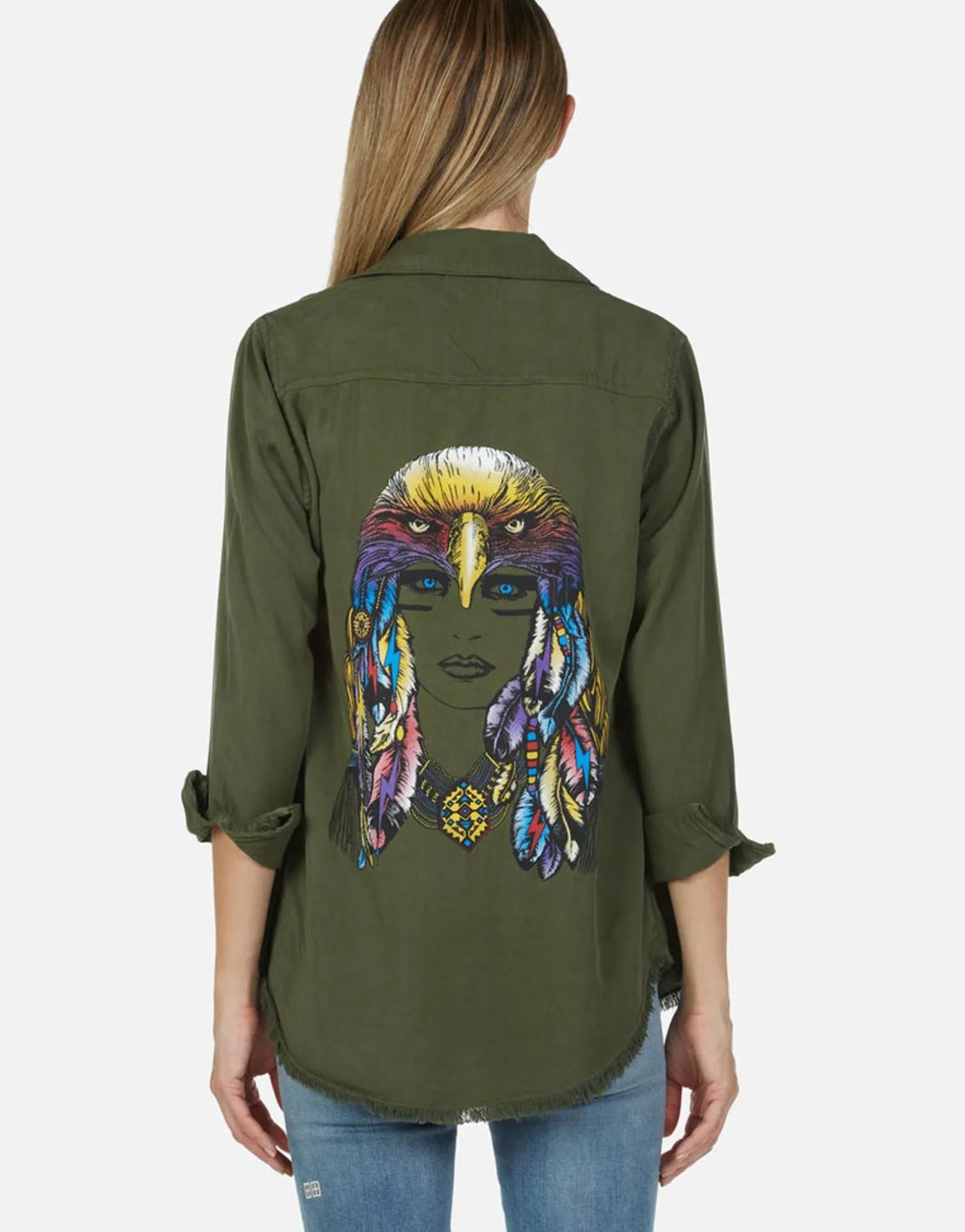 Rainbow Lady Eagle Printed On Ultra Soft Lightweight Button Up In Military By Lauren Moshi.