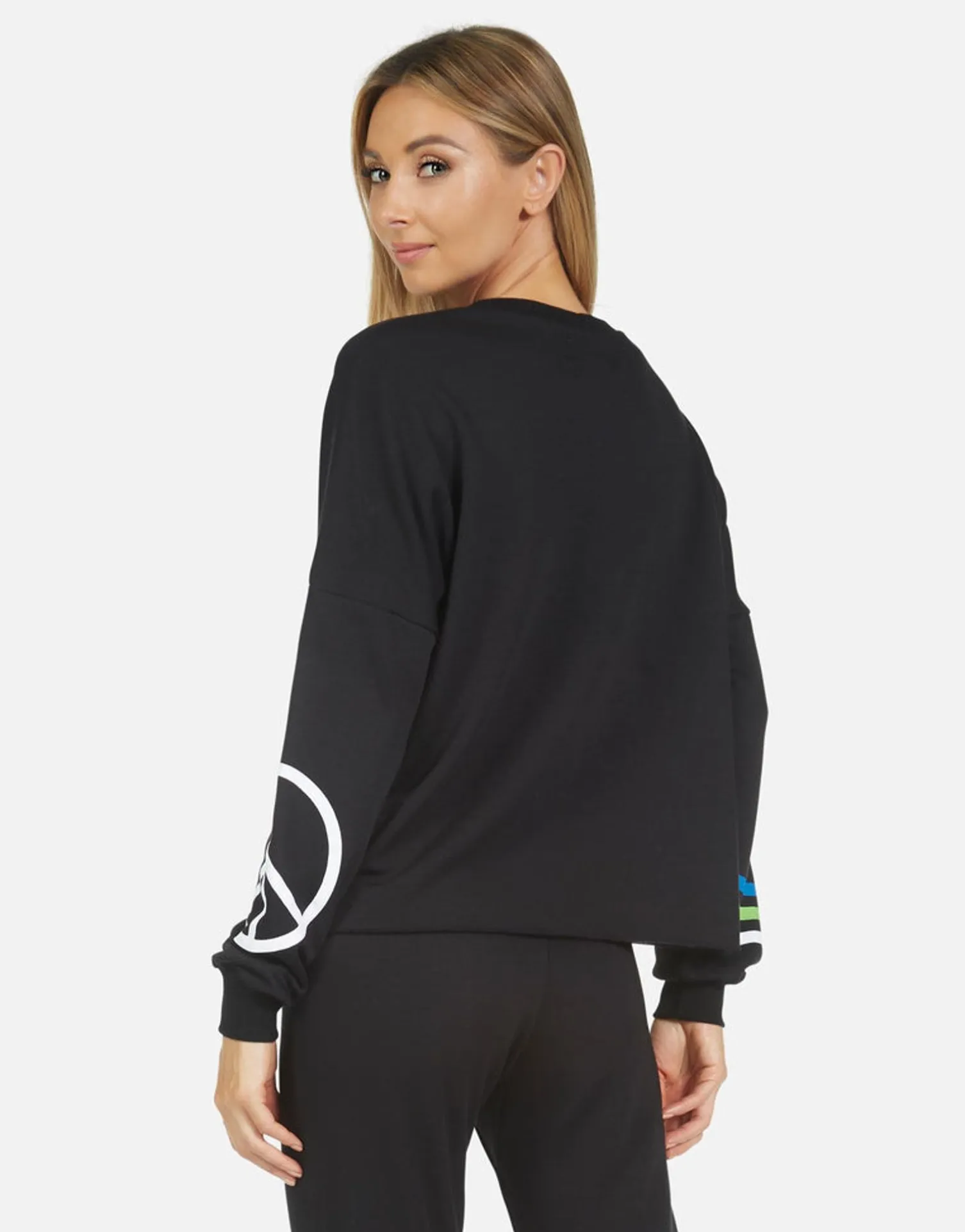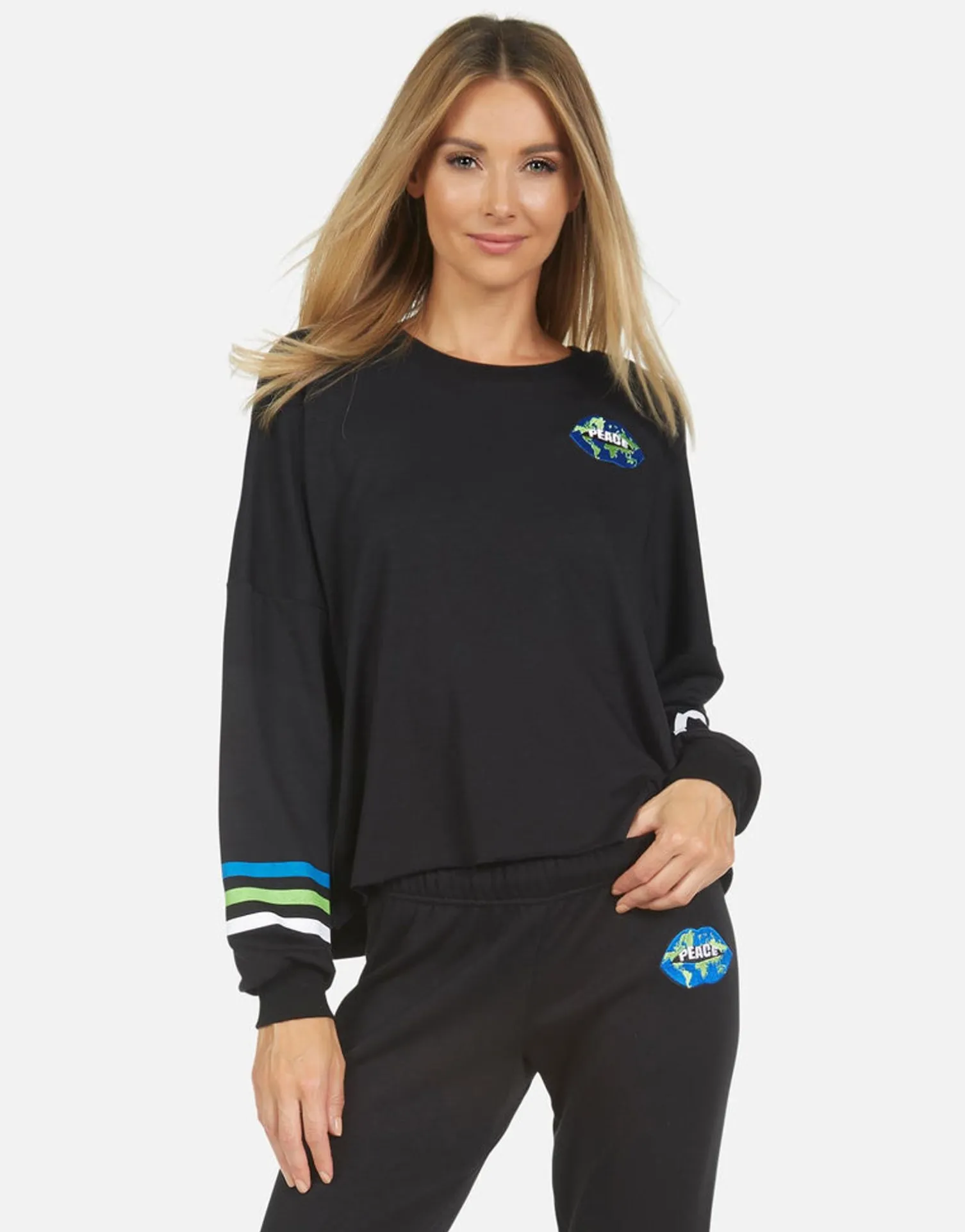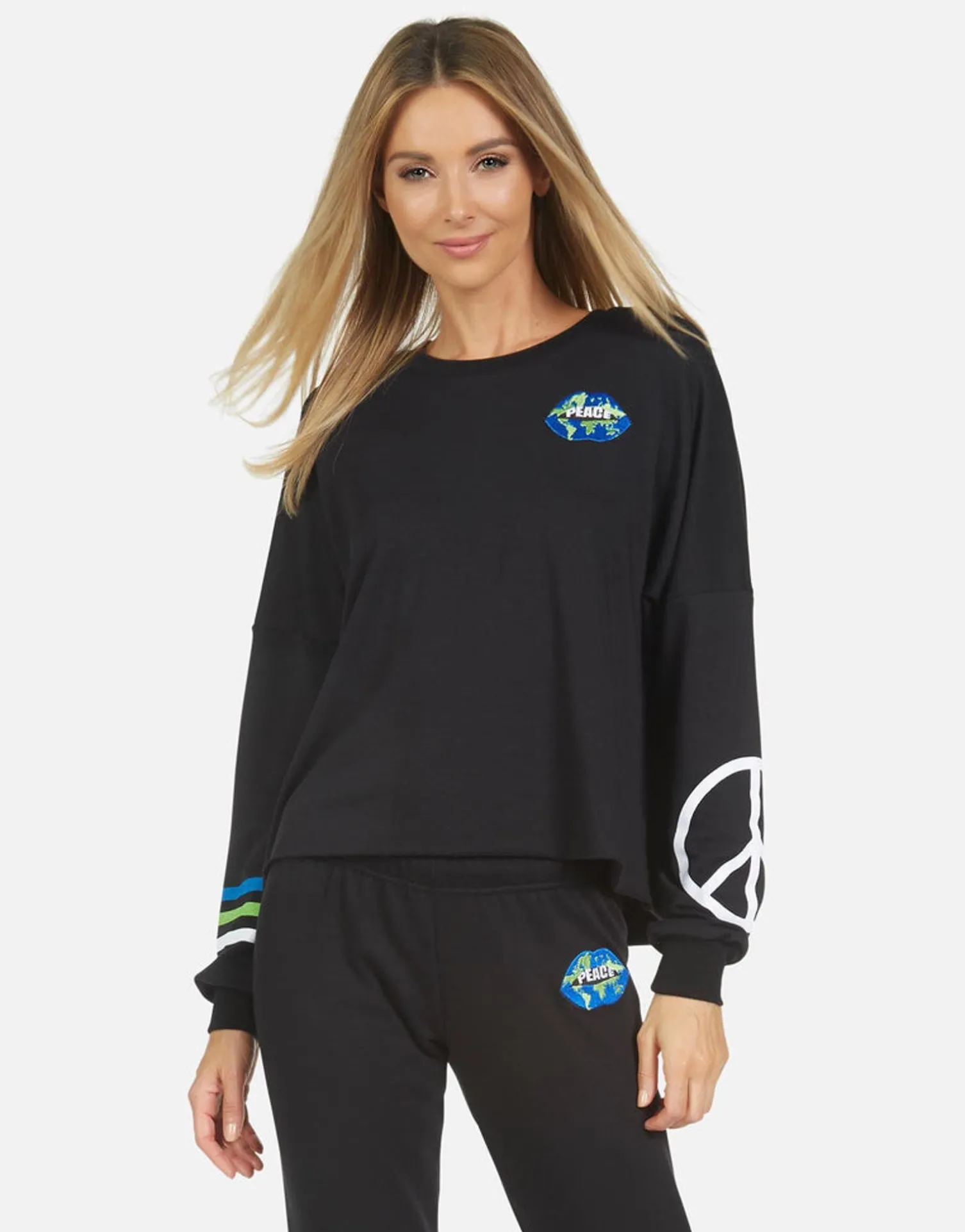 World Peace Lips Printed On Ultra Soft Lightweight Pullover In Black By Lauren Moshi.