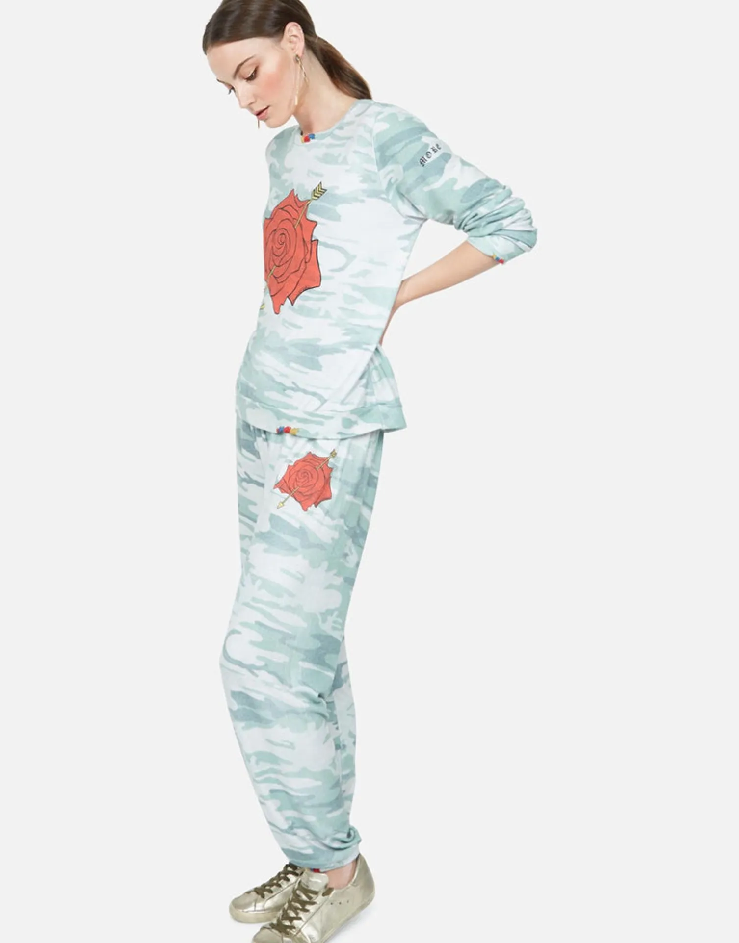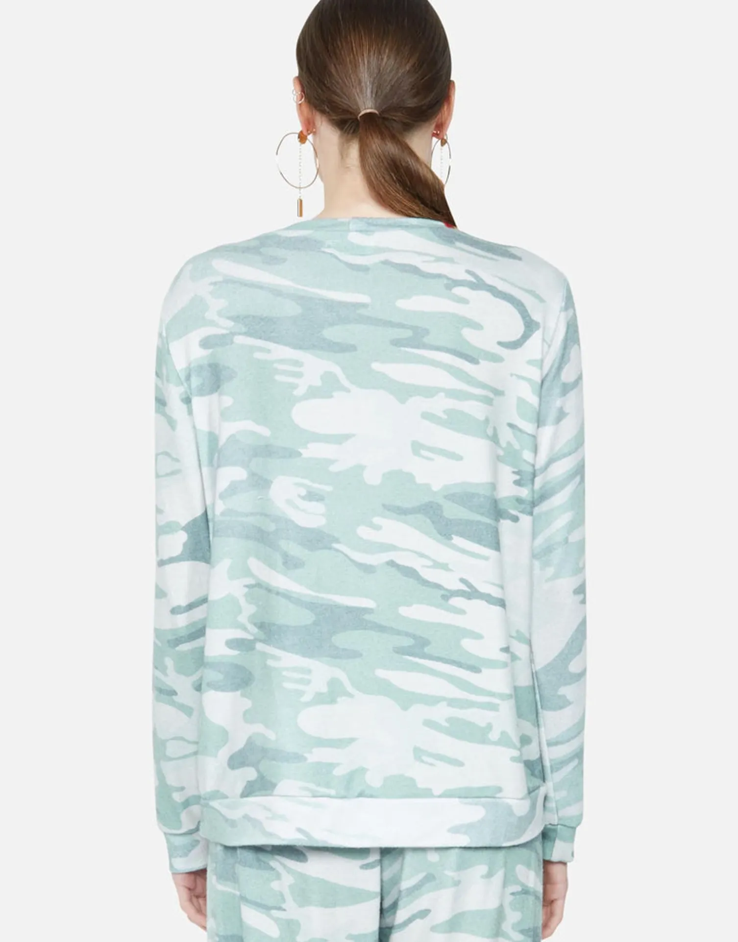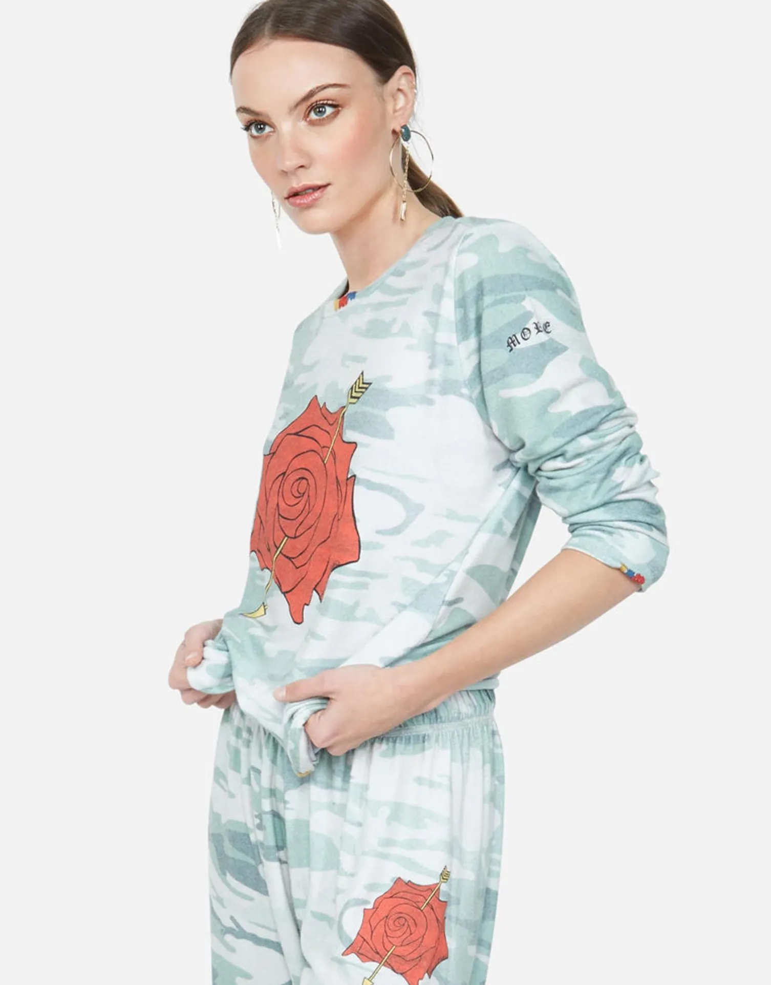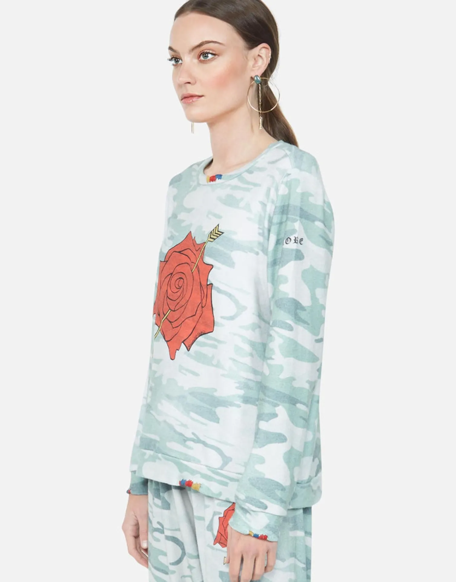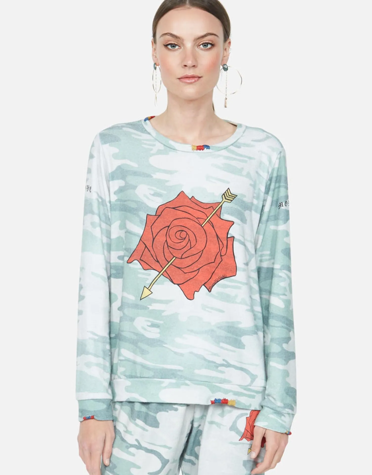 Love More Rose Printed On Super Soft Long Sleeve Pullover In Jade Camo By Lauren Moshi.