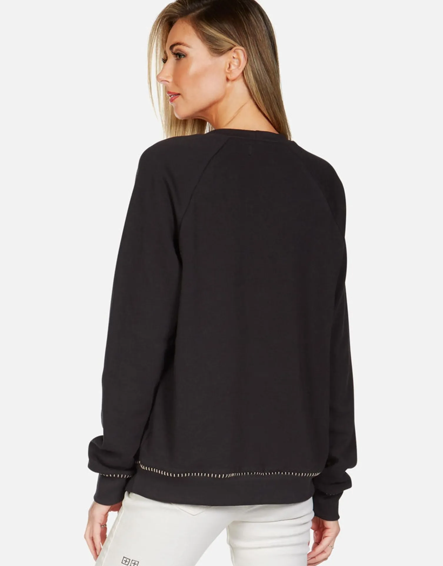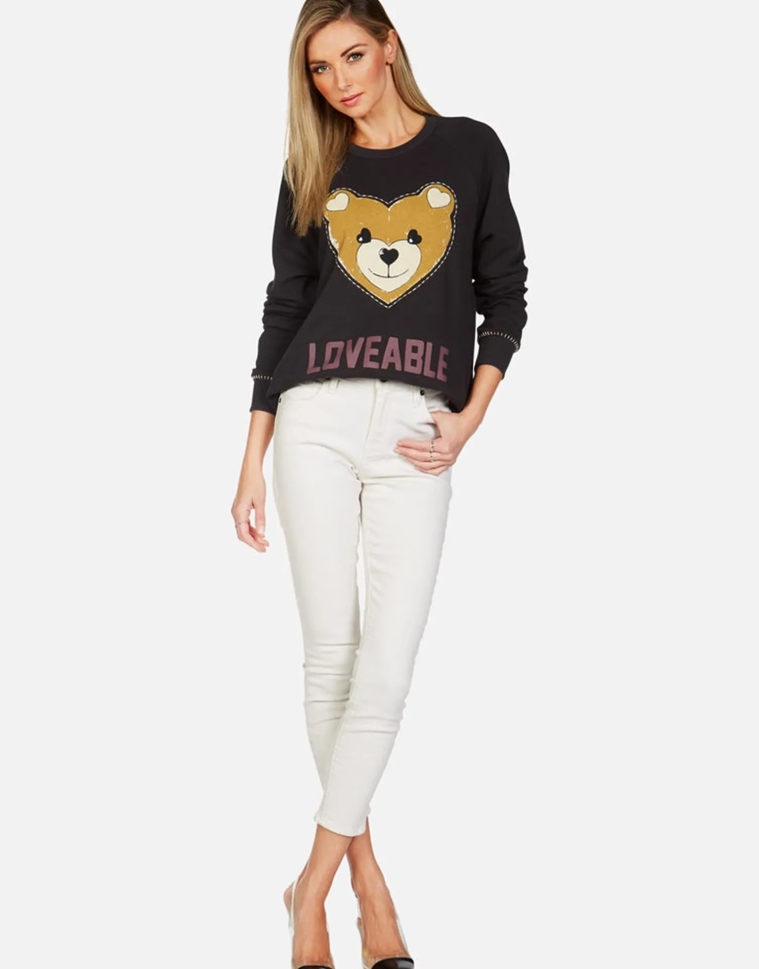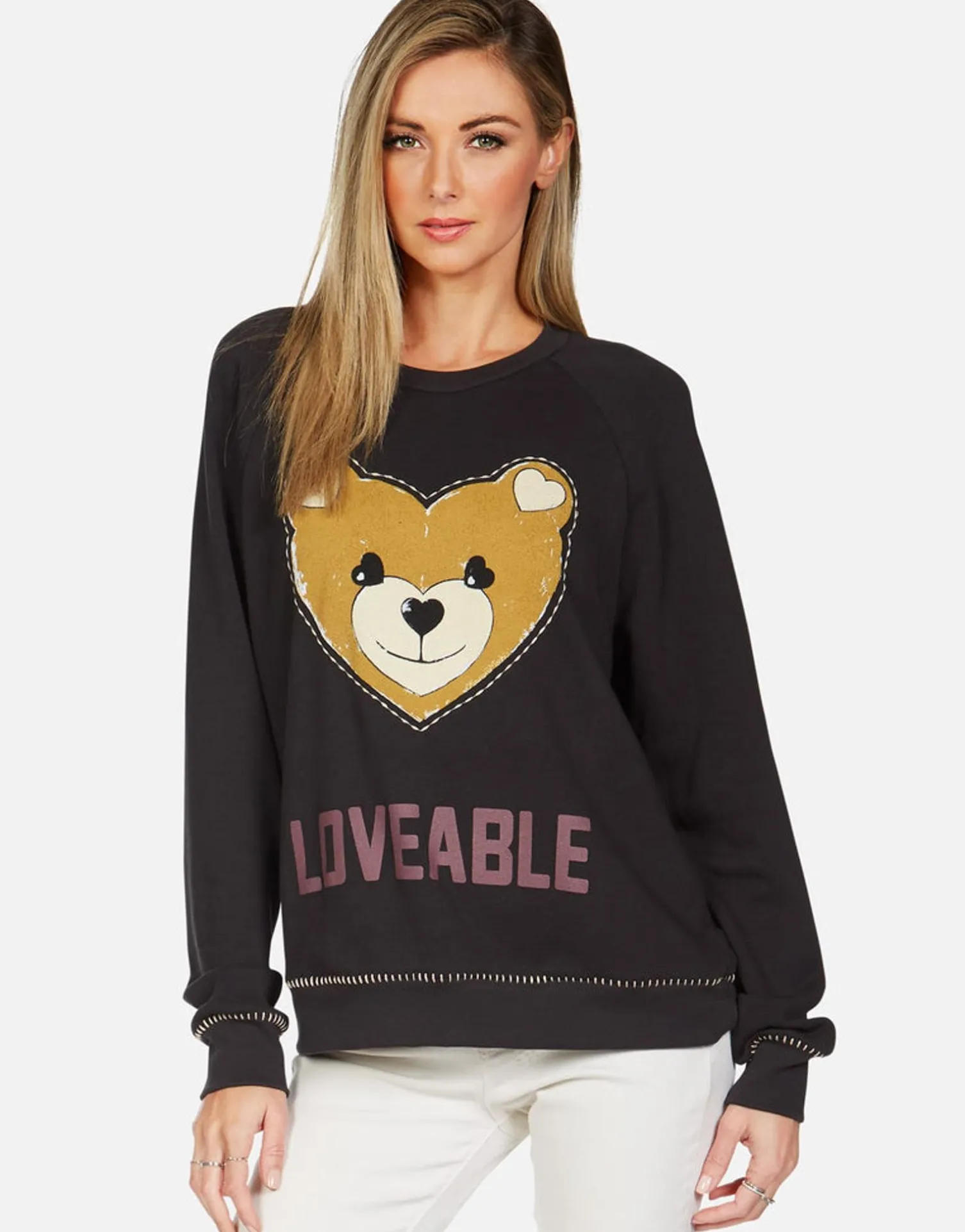 Loveable Heart Teddy Printed On Ultra Soft Lightweight Raglan Pullover In Onyx By Lauren Moshi.