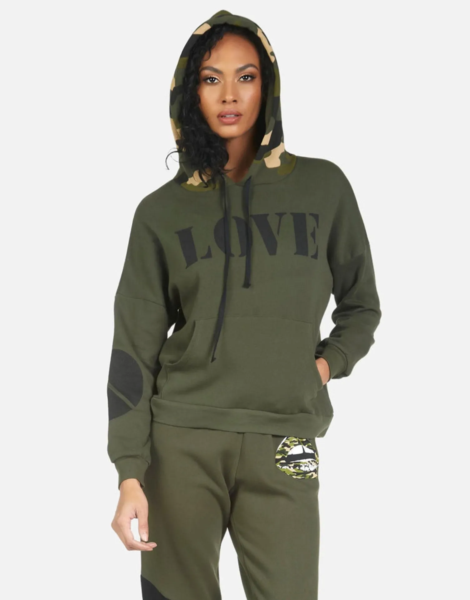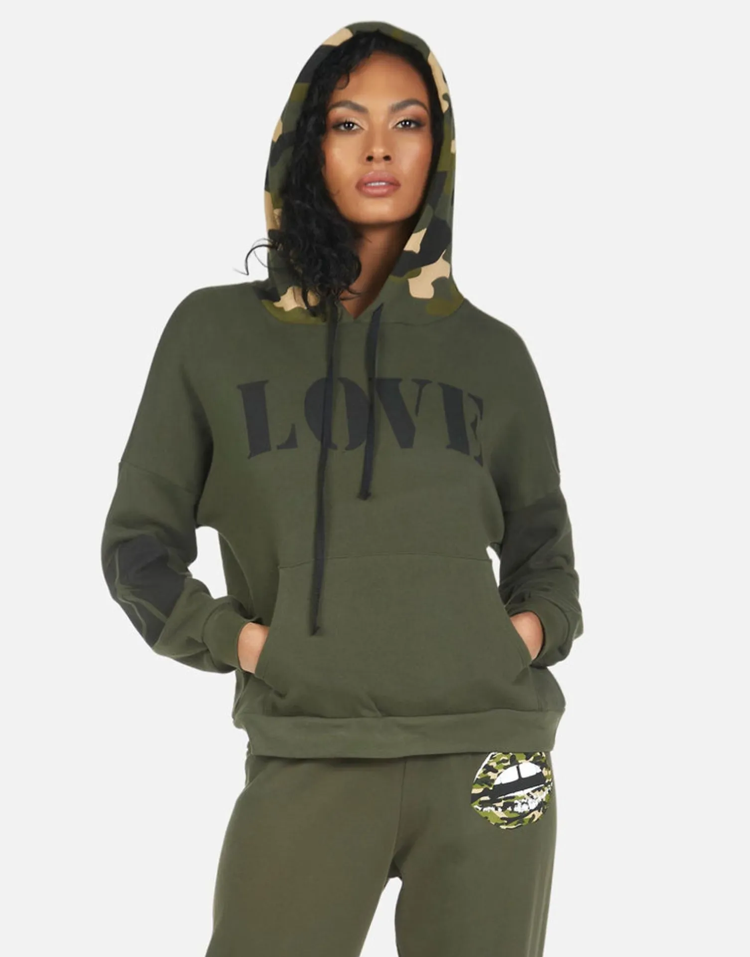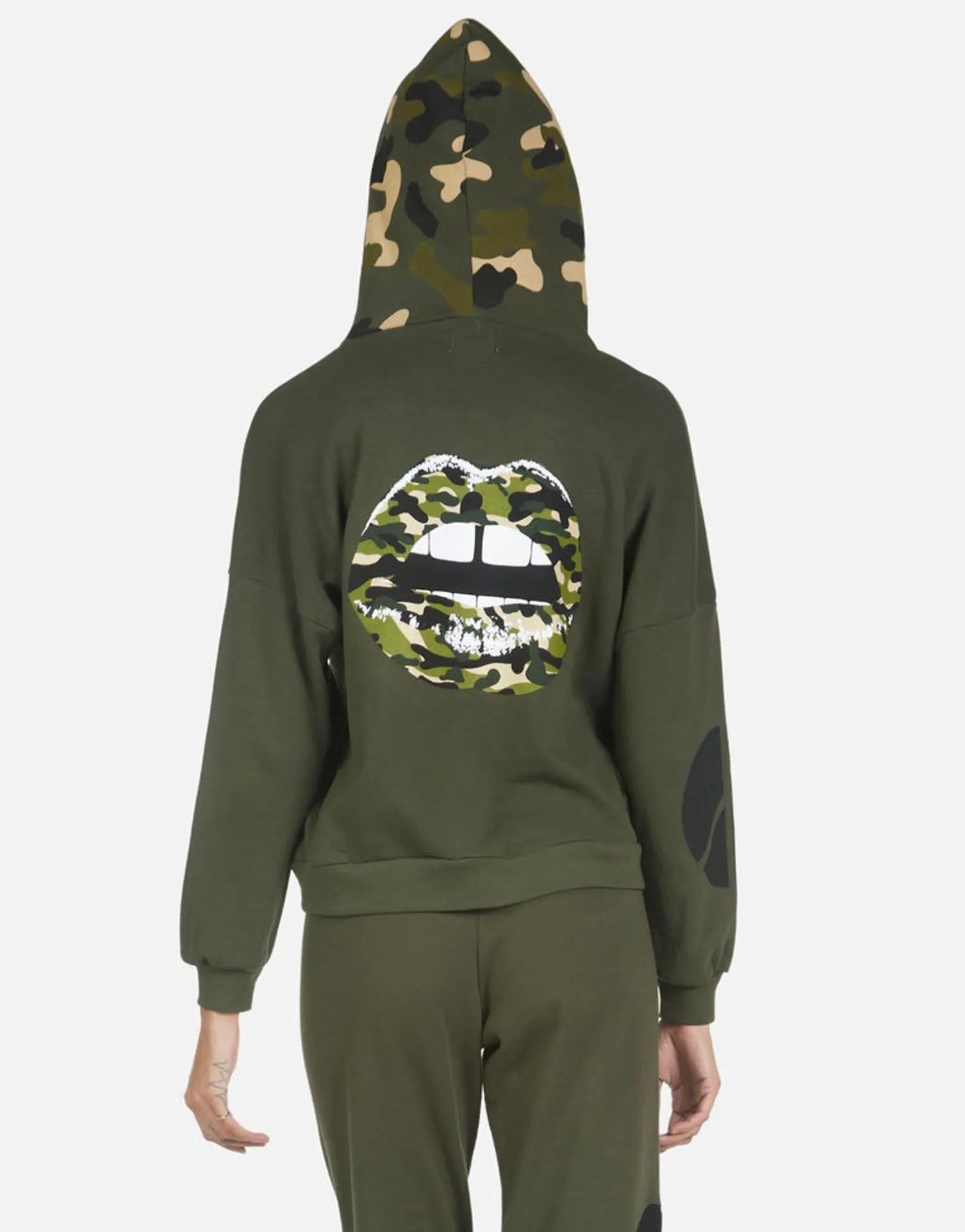 Camo Lip Printed On Ultra Soft Lightweight Hoodie In Forest/Camo By Lauren Moshi.