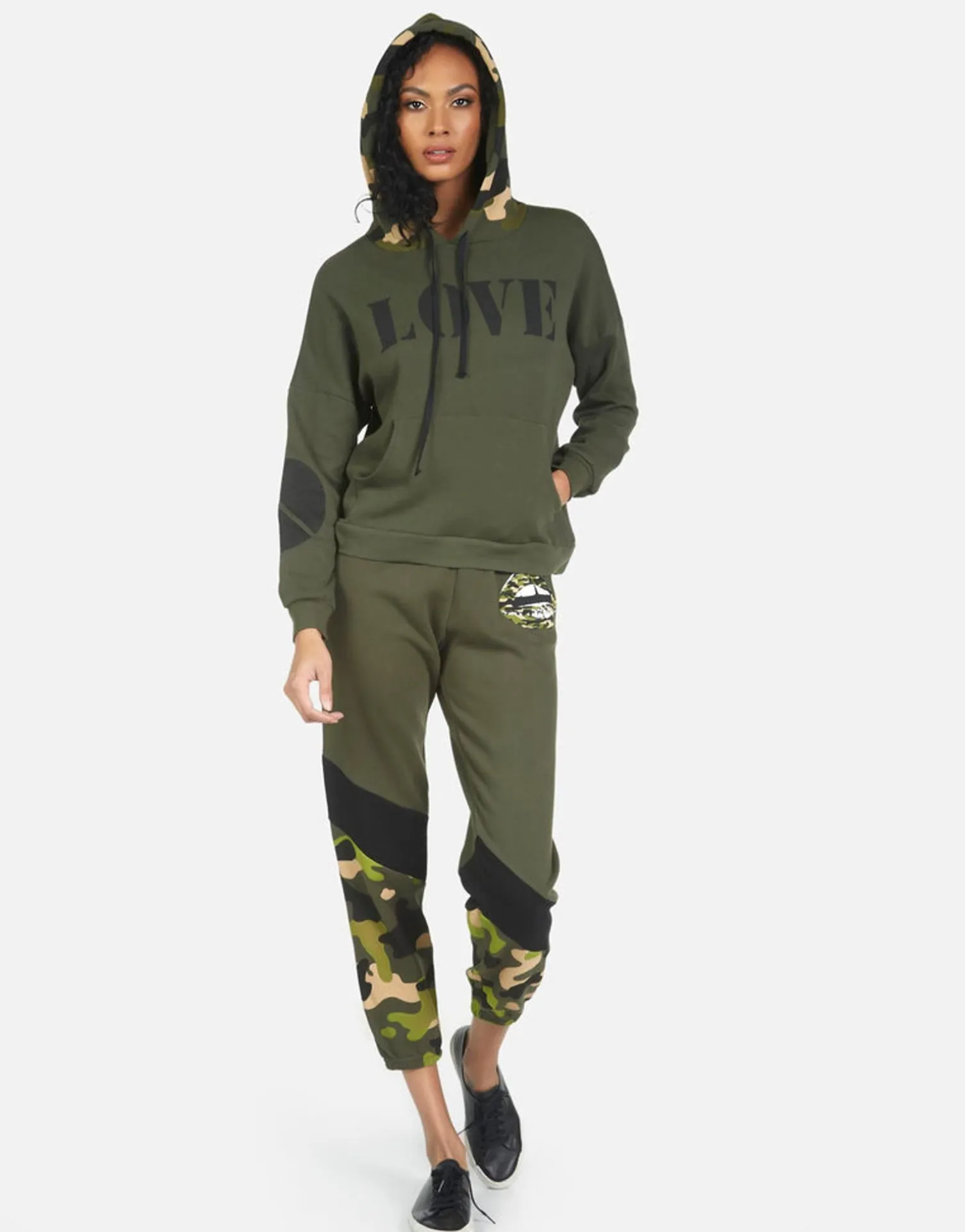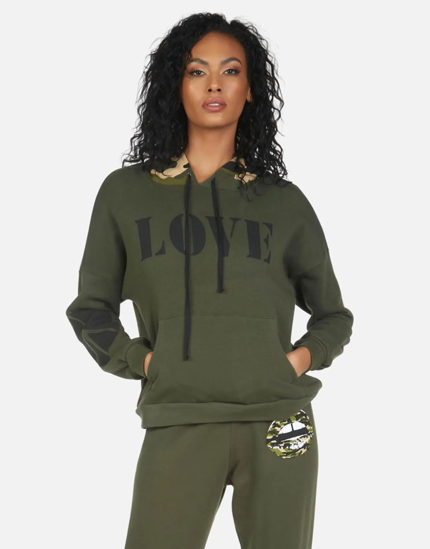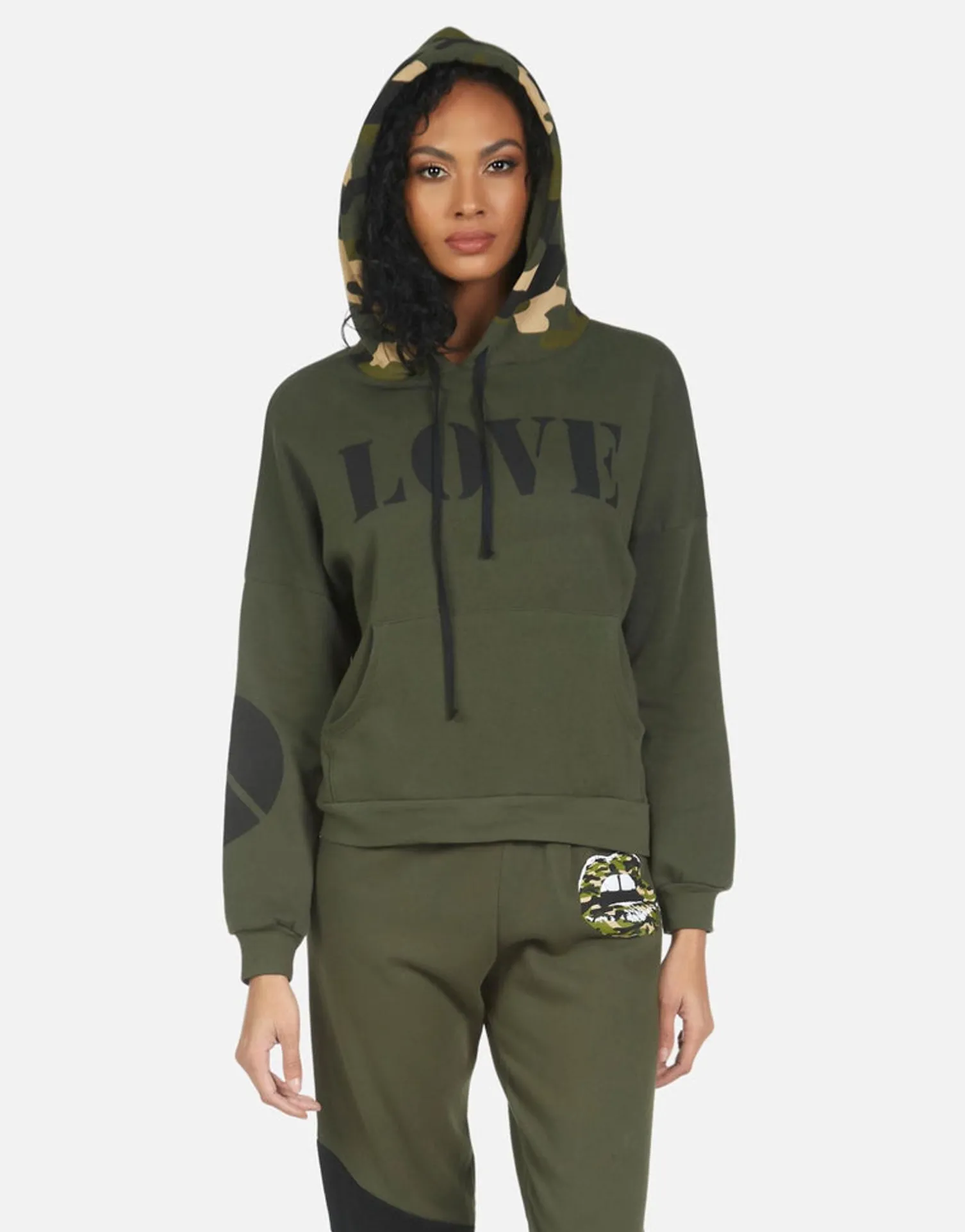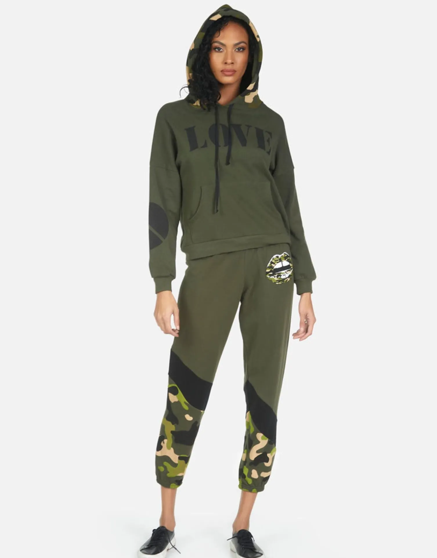 Camo Lip Printed On Ultra Soft Lightweight Hoodie In Forest/Camo By Lauren Moshi.