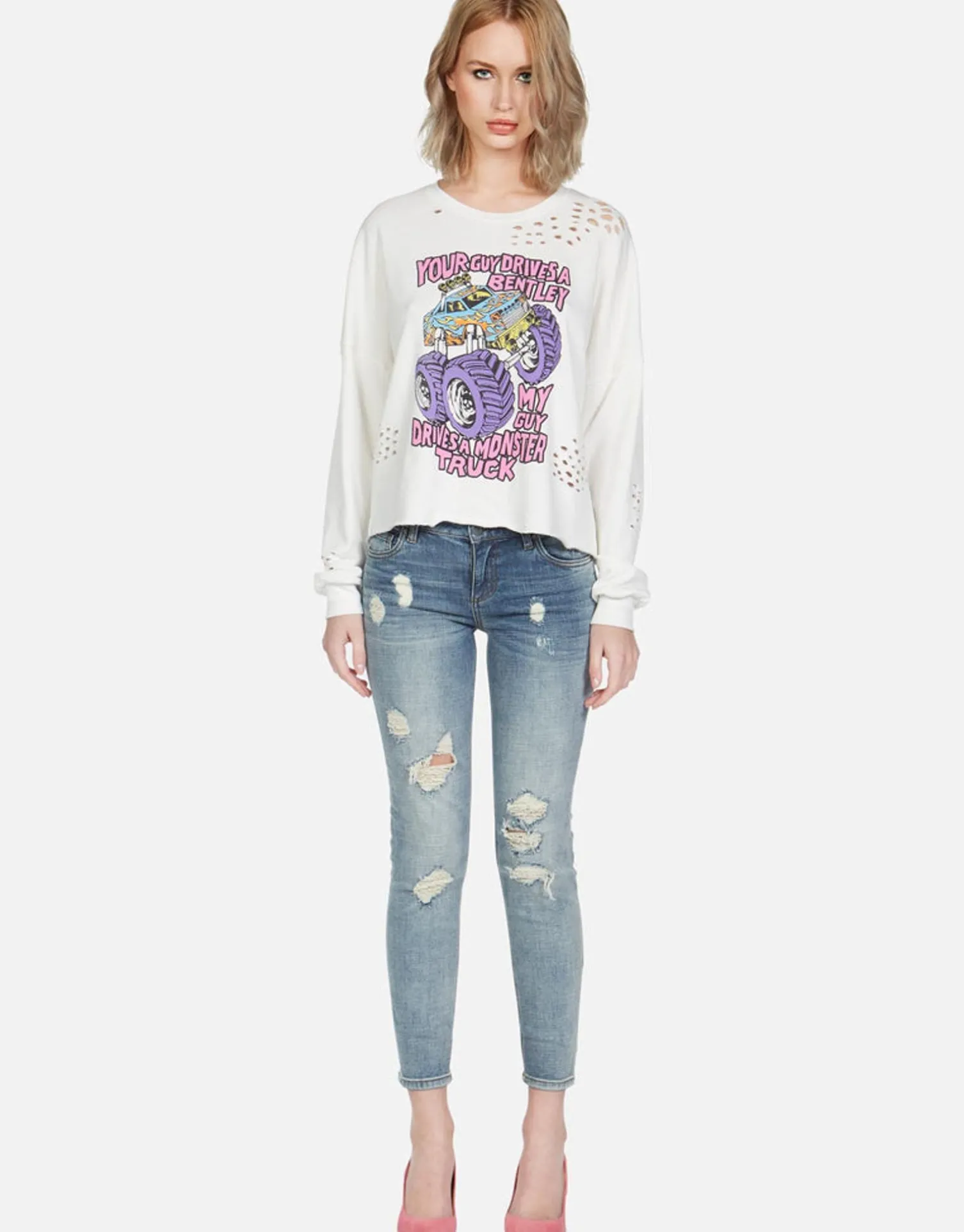 Monster Truck Printed On Ultra Soft Lightweight Pullover In Milk By Lauren Moshi.