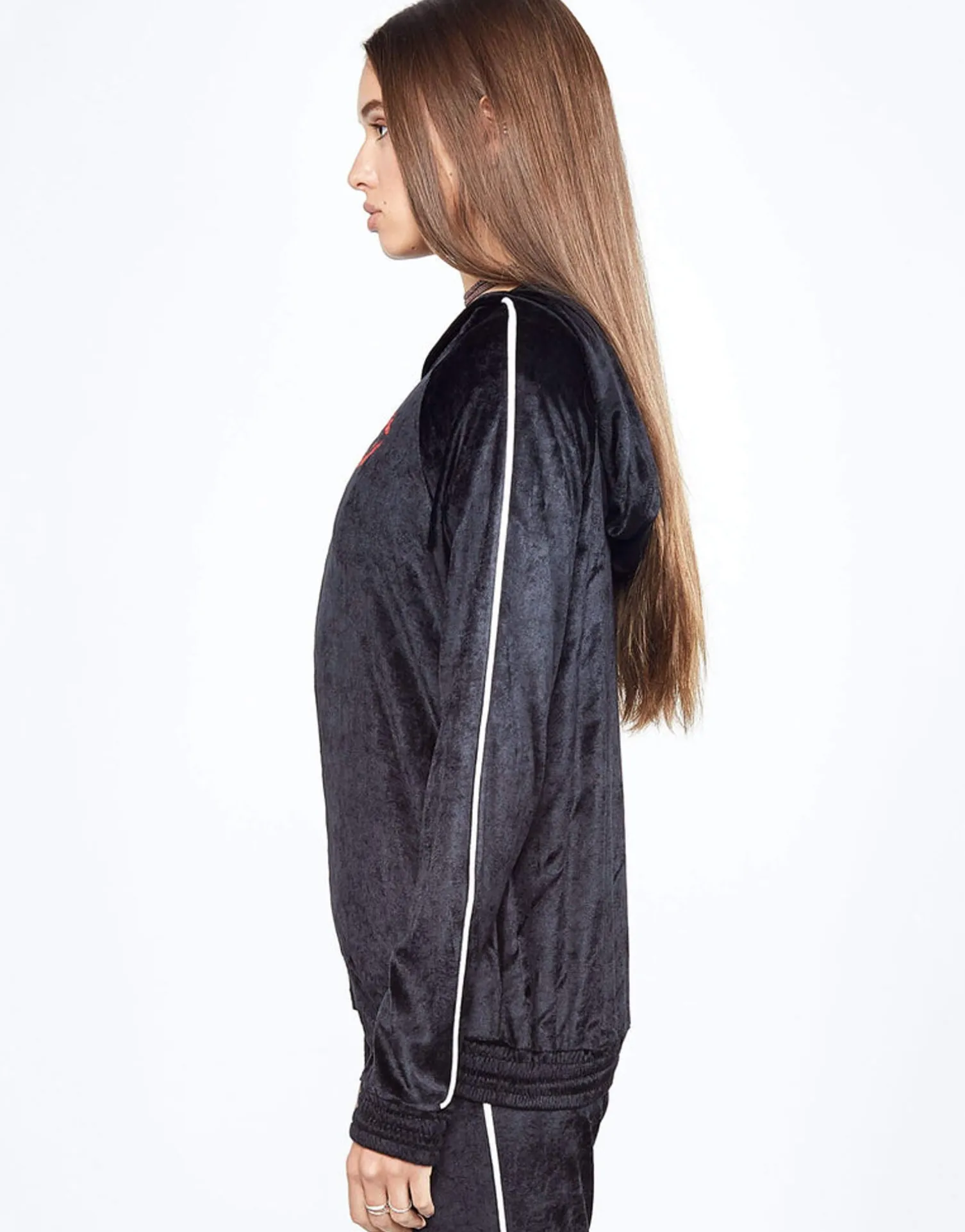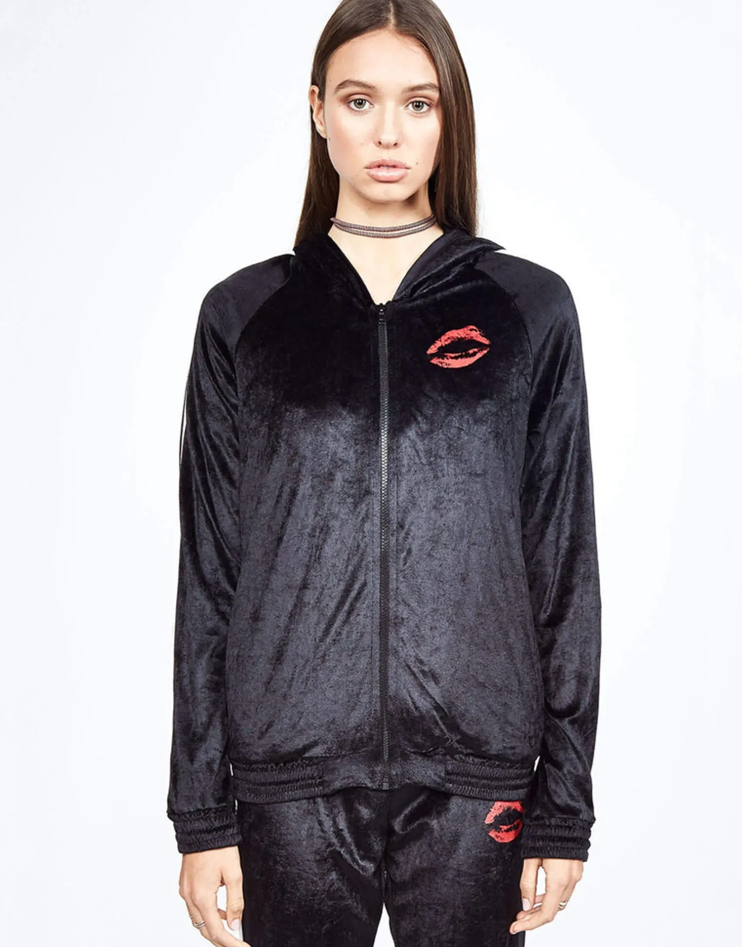 Watercolor Lip Printed On Ultra Soft Zip Up Pullover Hoodie In Black W/ White Piping By Lauren Moshi.