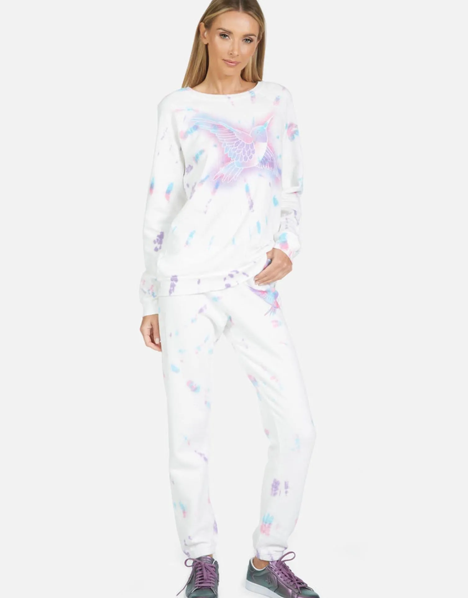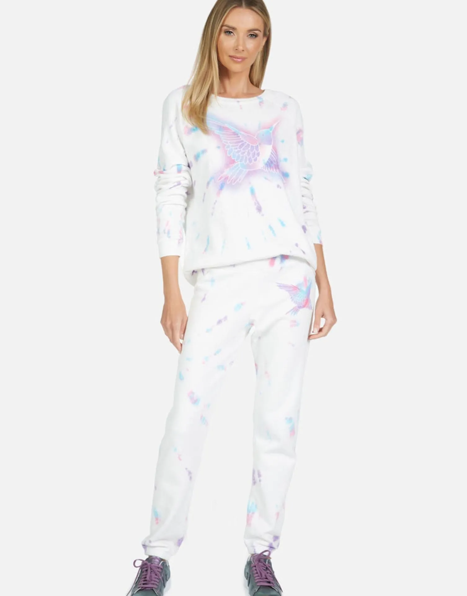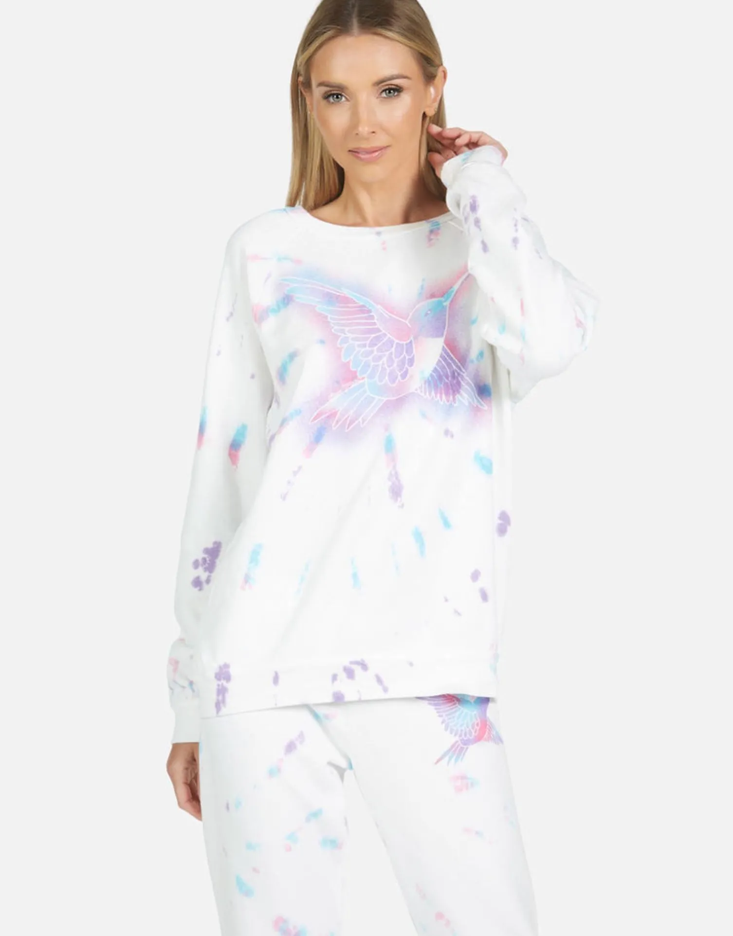 Hummingbird Printed On Ultra Soft Lightweight Pullover In Pastel Splash By Lauren Moshi.
