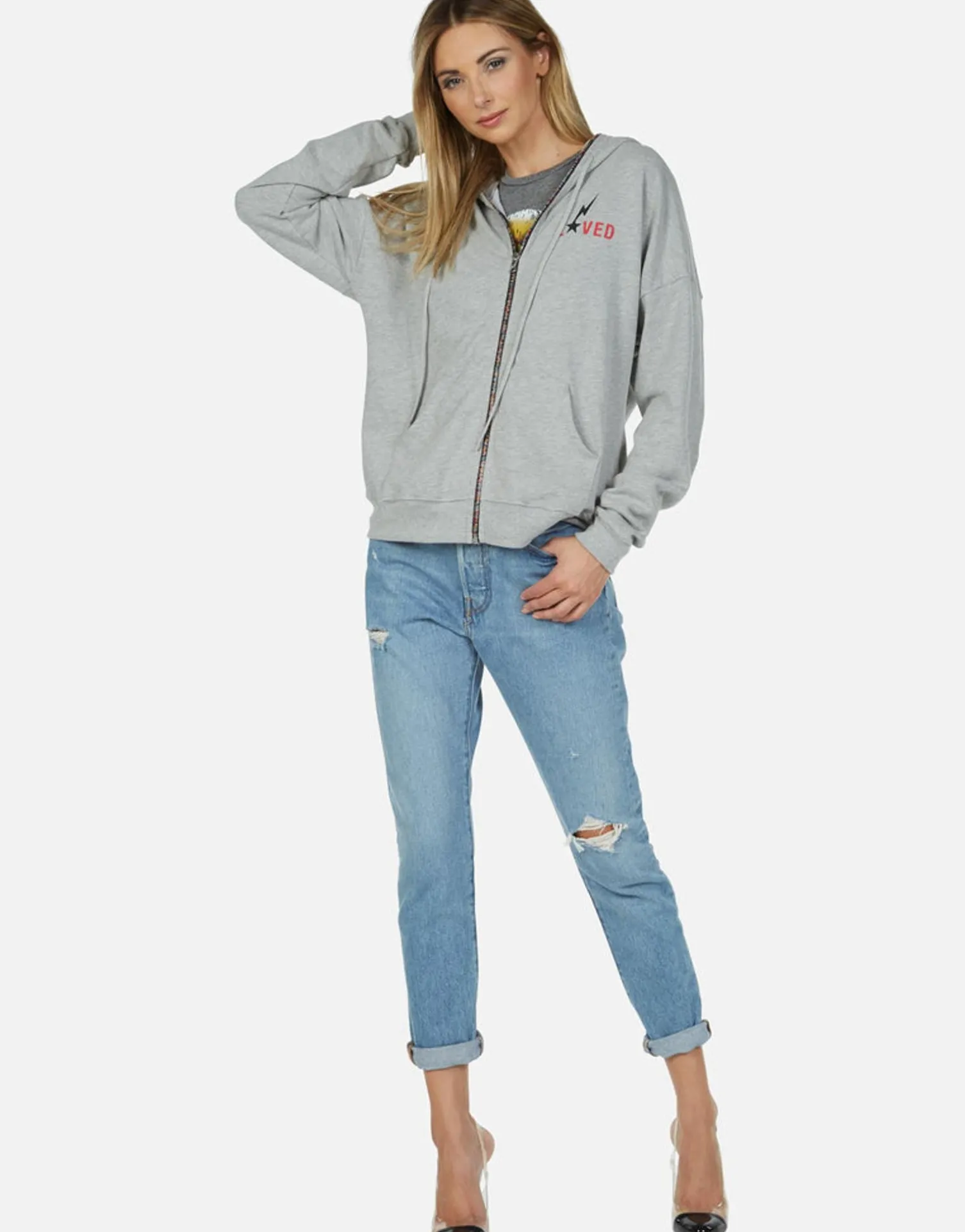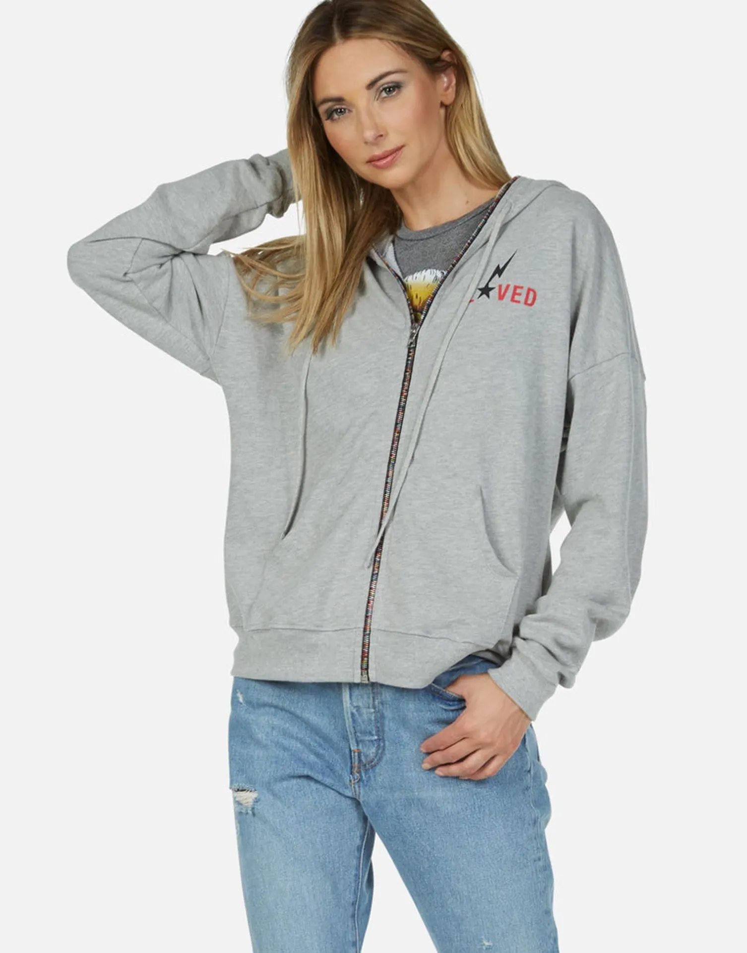 Rainbow Lightning Eagle Printed On Ultra Soft Hoodie In Heather Grey By Lauren Moshi.