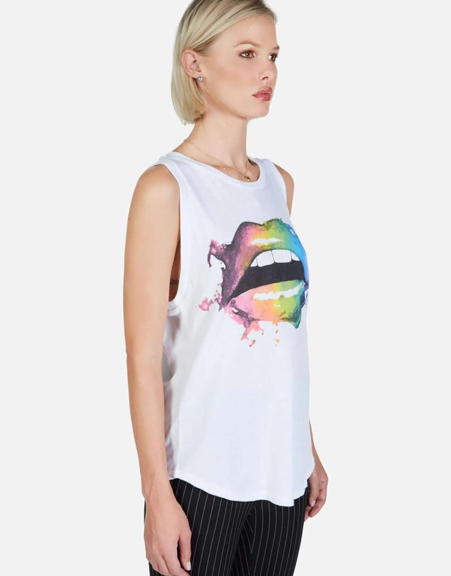 Rainbow Smudge Lip Printed On Ultra Soft Lightweight High Neck Tank By Lauren Moshi.