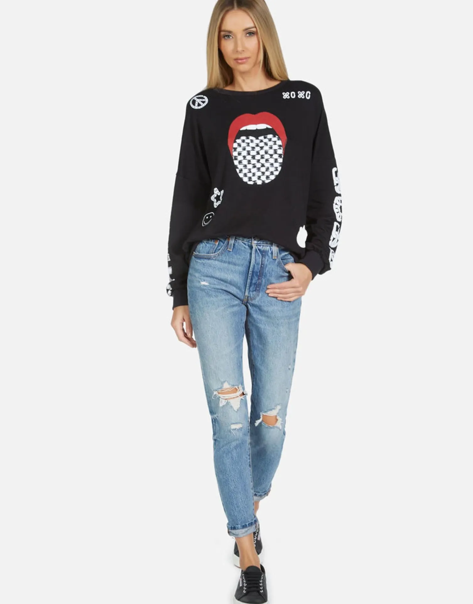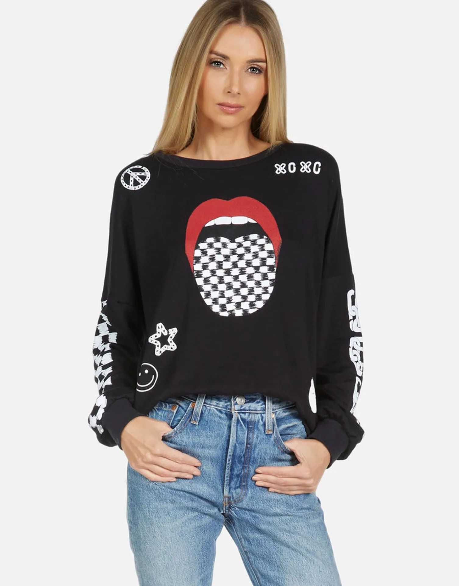 Checker Tongue Printed On Ultra Soft Lightweight Pullover In Black By Lauren Moshi.