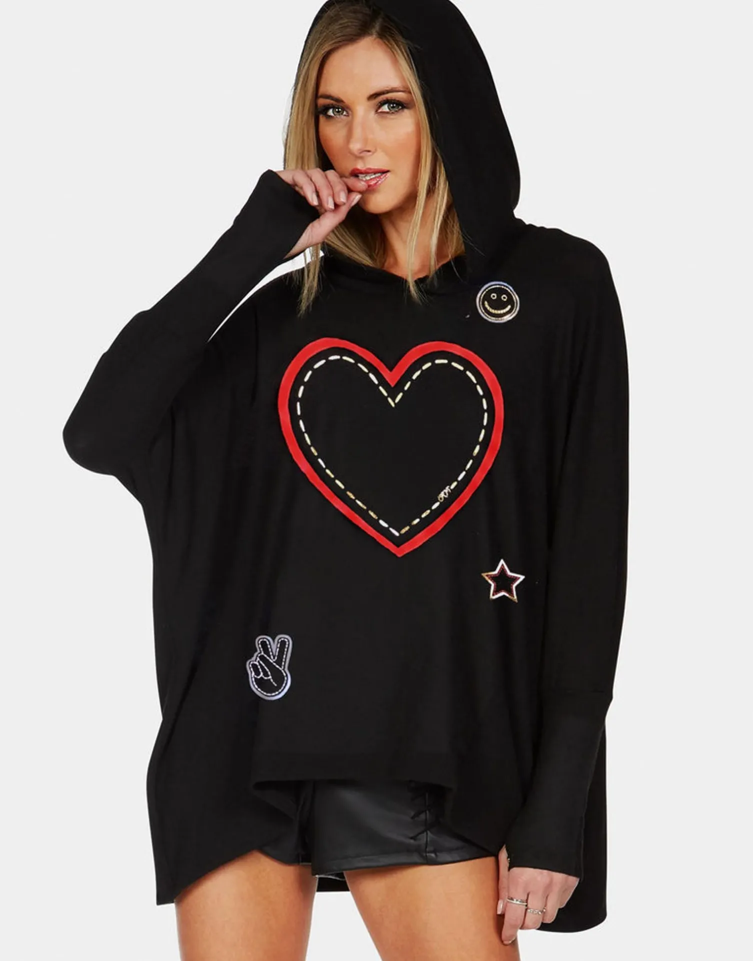 | Stitched Heart Elements Printed On Ultra Soft Lightweight Hoodie In Jet Black By Lauren Moshi.