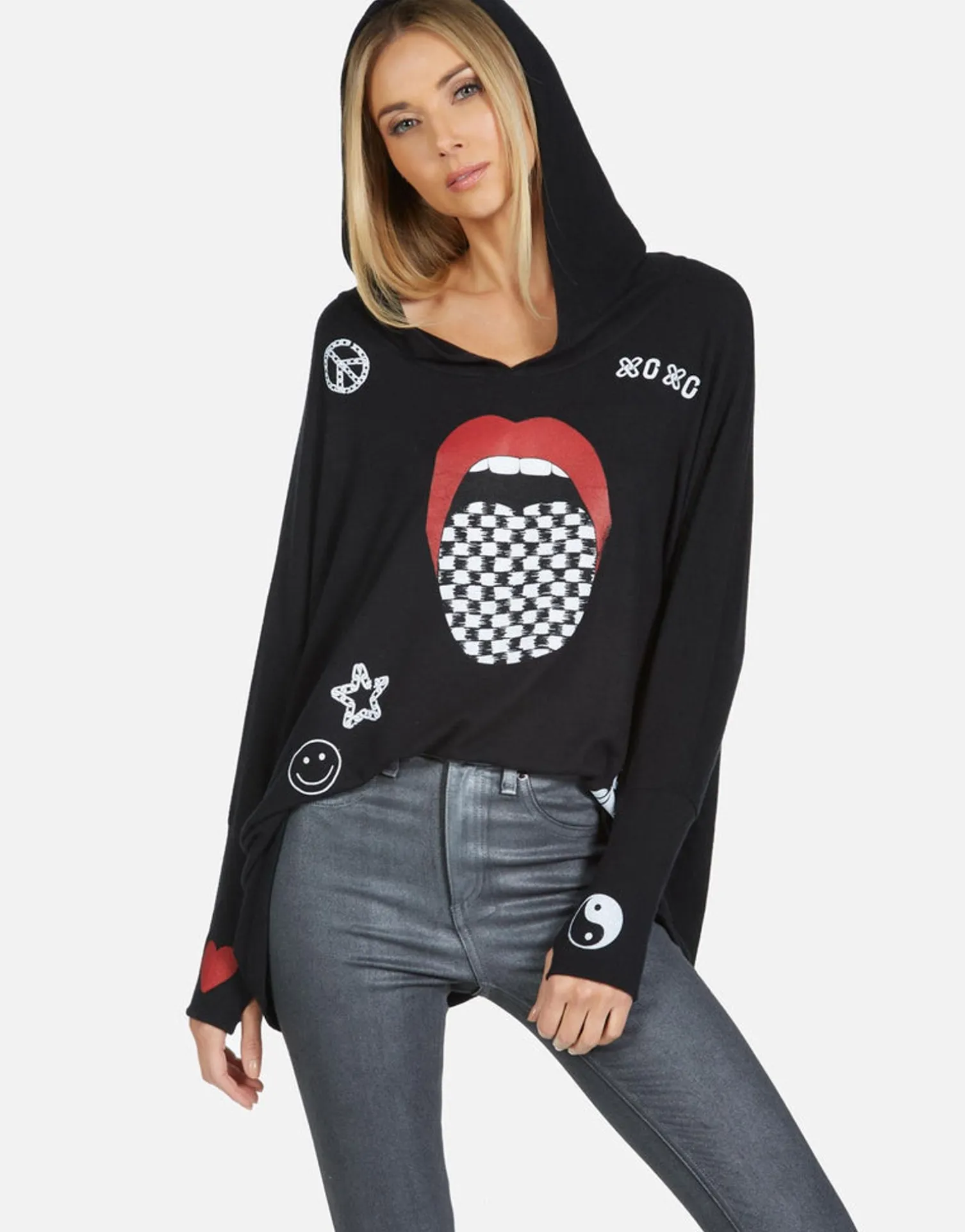 Checker Tongue Printed On Ultra Soft Lightweight Hoodie In Black By Lauren Moshi.